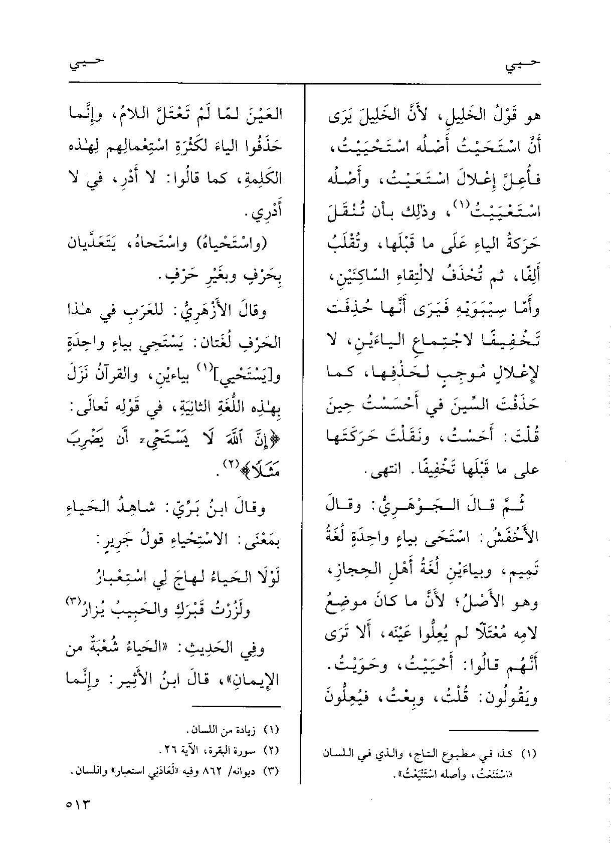 وقالَ الأزْهرِيُّ: للعَرَب فِي هَذَا الحَرْف لُغَتانِ يَسْتَحِي بياءٍ واحِدَةٍ وبياءَيْن، والقُرْآنُ نَزَلَ بِهَذِهِ اللغَةِ الثانِيَةِ فِي قوْلِه تَعَالَى: {إنَّ اللَّهَ لَا يَسْتَحِي أنْ يَضْرِبَ مَثَلاً} .