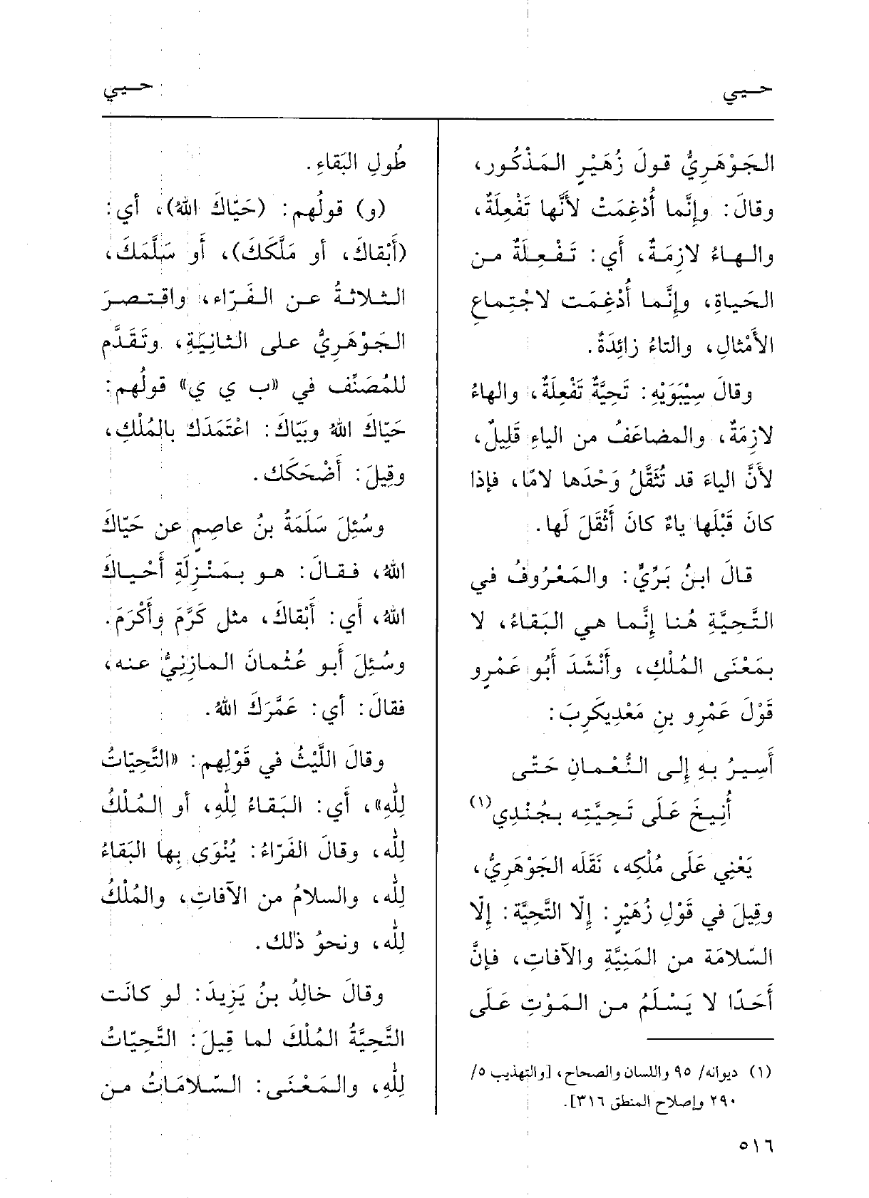 الجَوهرِيُّ قَوْلَ زُهَير المَذْكُور، قالَ: وإنَّما أُدْغِمَتْ لأنَّها تَفْعِلَة، والهاءُ لازِمَةٌ، أَي تَفْعِلَة من الحَياةِ، وإنَّما أُدْغِمَتْ لاجْتِماعِ الأمْثالِ، والتاءُ زائِدَةٌ.