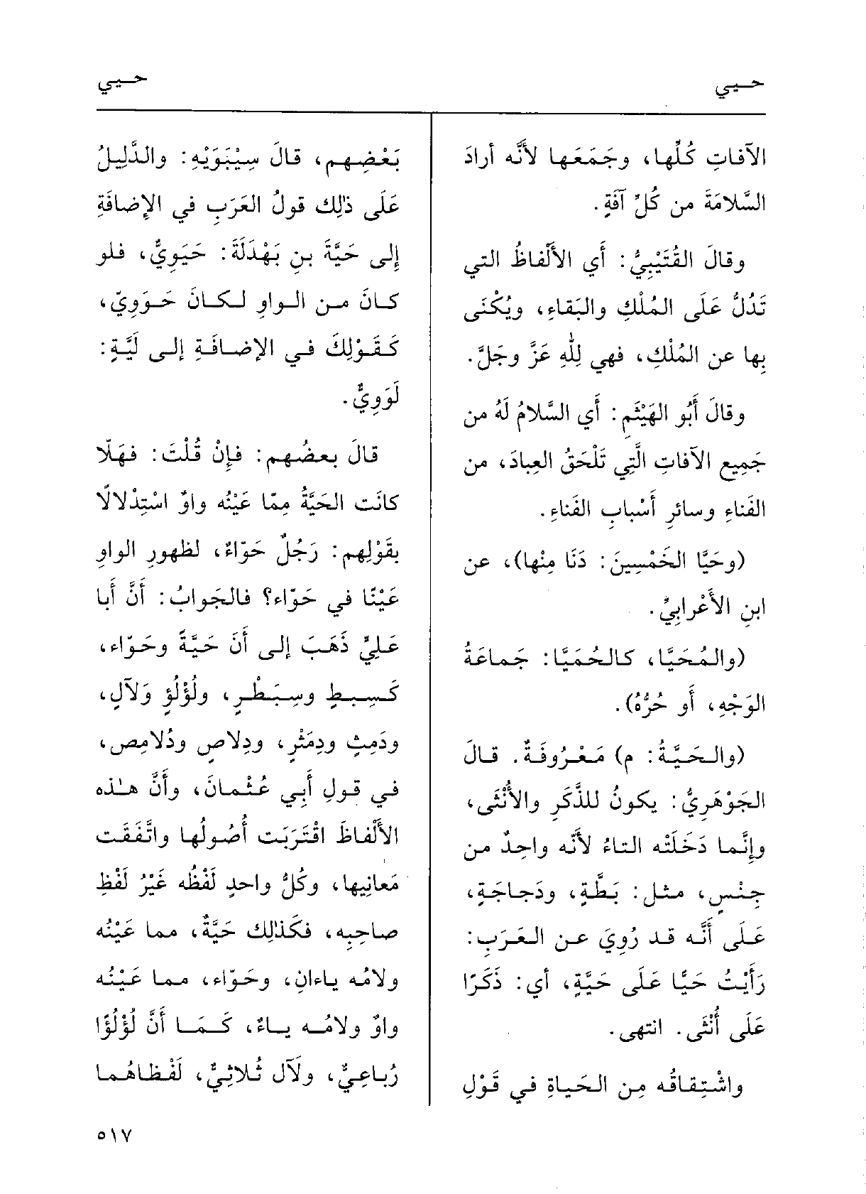 واشْتِقاقُه من الحَياةِ فِي قوْلِ بعضِهم؛ قالَ سِيْبَوَيْهِ: والدَّليلُ على ذلكَ قَوْلُ العَرَبِ فِي الإضَافةِ إِلَى حَيَّةَ بنِ بَهْدَلَة حَيَوِيٌّ، فَلَو كانَ مِن الواوِ لكانَ حَوَوِيّ كقَوْلِكَ فِي الإضافَةِ إِلَى لَيَّة لَوَوِيُّ.