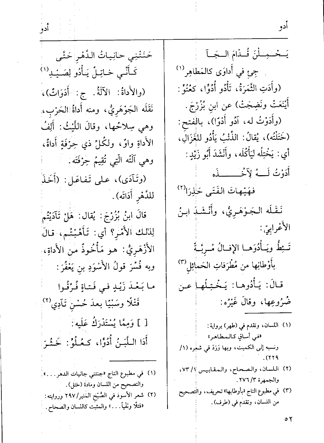 يَحْمِلْنَ قُدَّامَ الجَآجِيء فِي أَداوَى كالمَطاهِر ( {وأَدَتِ الثَّمرَةُ} تأْدُو {أُدُوّاً، كعُتُوَ: أَيْنَعَتْ ونَضِجَتْ؛ عَن ابنِ بُزُرْج.