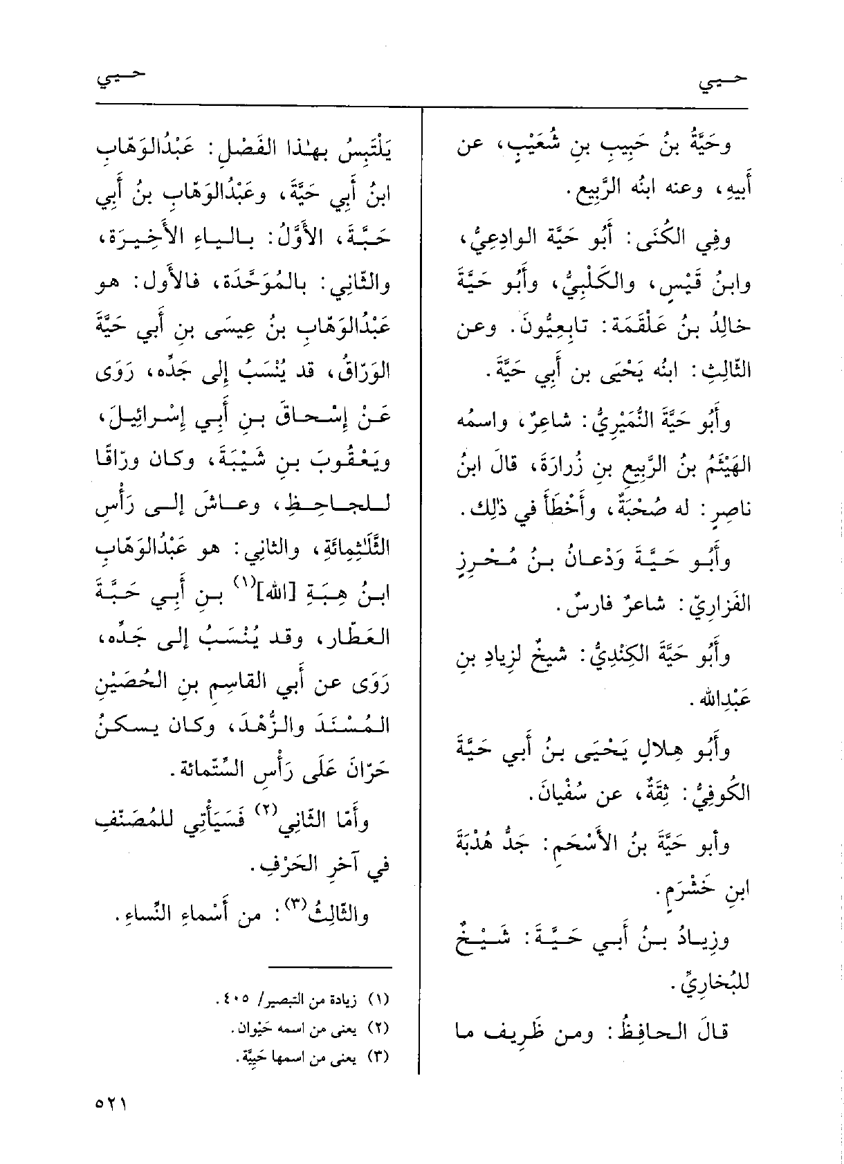 قالَ الحافِظُ: ومِن ظريفِ مَا يَلْتَبسُ بِهَذَا الفَصْل: عَبْد الوهَابِ بن أَبي حَيَّة وعَبْد الوهابِ بن أَبي حَبَّة، الأوَّلُ بالياءِ الأَخيرَةِ، وَالثَّانِي بالموحَّدَةِ، فالأَوَّل هُوَ عبدُ الوهابِ بنُ عيسَى بن أَبي حَيَّة الوَرَّاقُ قد يُنْسَبُ إِلَى جَدِّه رَوَى عَن إسْحاقِ بنِ أَبي إسْرائيل ويَعْقوب بنِ شيبَةَ وكانَ وَرَّاقاً للجاحِظِ وعاشَ إِلَى رأْسِ الثلثمائة، وَالثَّانِي هُوَ عبدُ الوهابِ بنُ هبَةَ بنِ أَبي حَبَّة العَطَّار وَقد يُنْسَبُ إِلَى جَدِّه، رَوَى عَن أَبي القاسِمِ بنِ الحصينِ المُسْندَ، والزهدَ وَكَانَ يَسْكنُ حرَّان على رأْسِ الستمائةِ، وأَمَّا الثَّاني فسَيَأْتي للمصنِّفِ فِي آخرِ الحَرْف.
