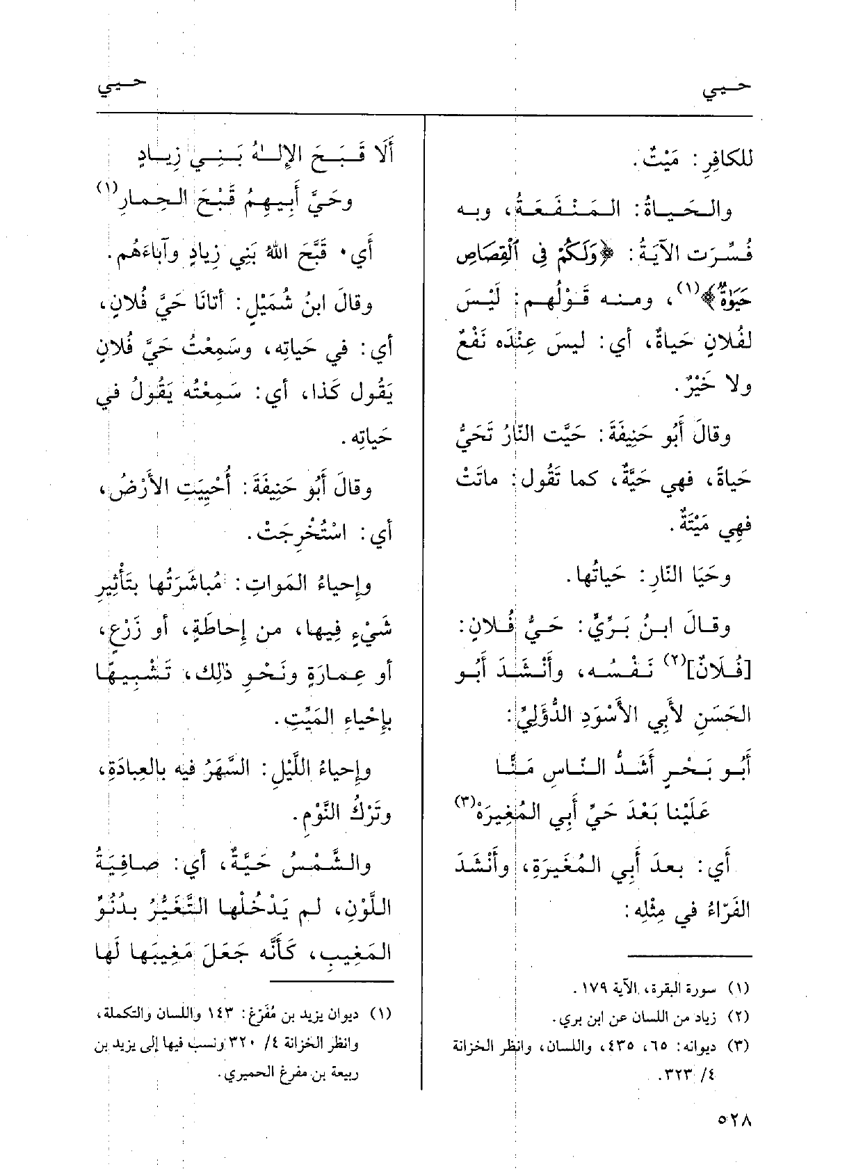 وقالَ ابنُ برِّي: حَيُّ فلانٍ نَفْسُه؛ وأَنْشَدَ أَبو الحَسَنِ لأبي الأَسْود الدُّؤَليّ: