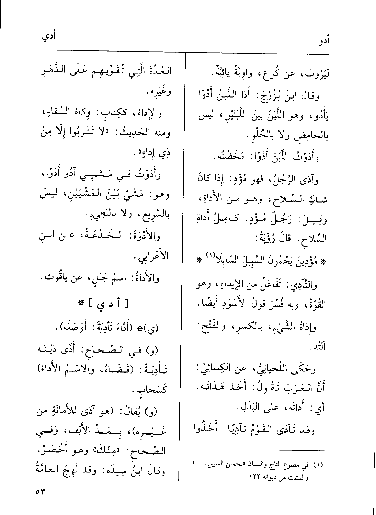 وأَدَوْتُ فِي مَشْيِي {آدُو} أَدْواً: وَهُوَ مَشْيٌ بَين المَشْيَيْنِ ليسَ بالسَّريعِ وَلَا بالبَطِيءِ.