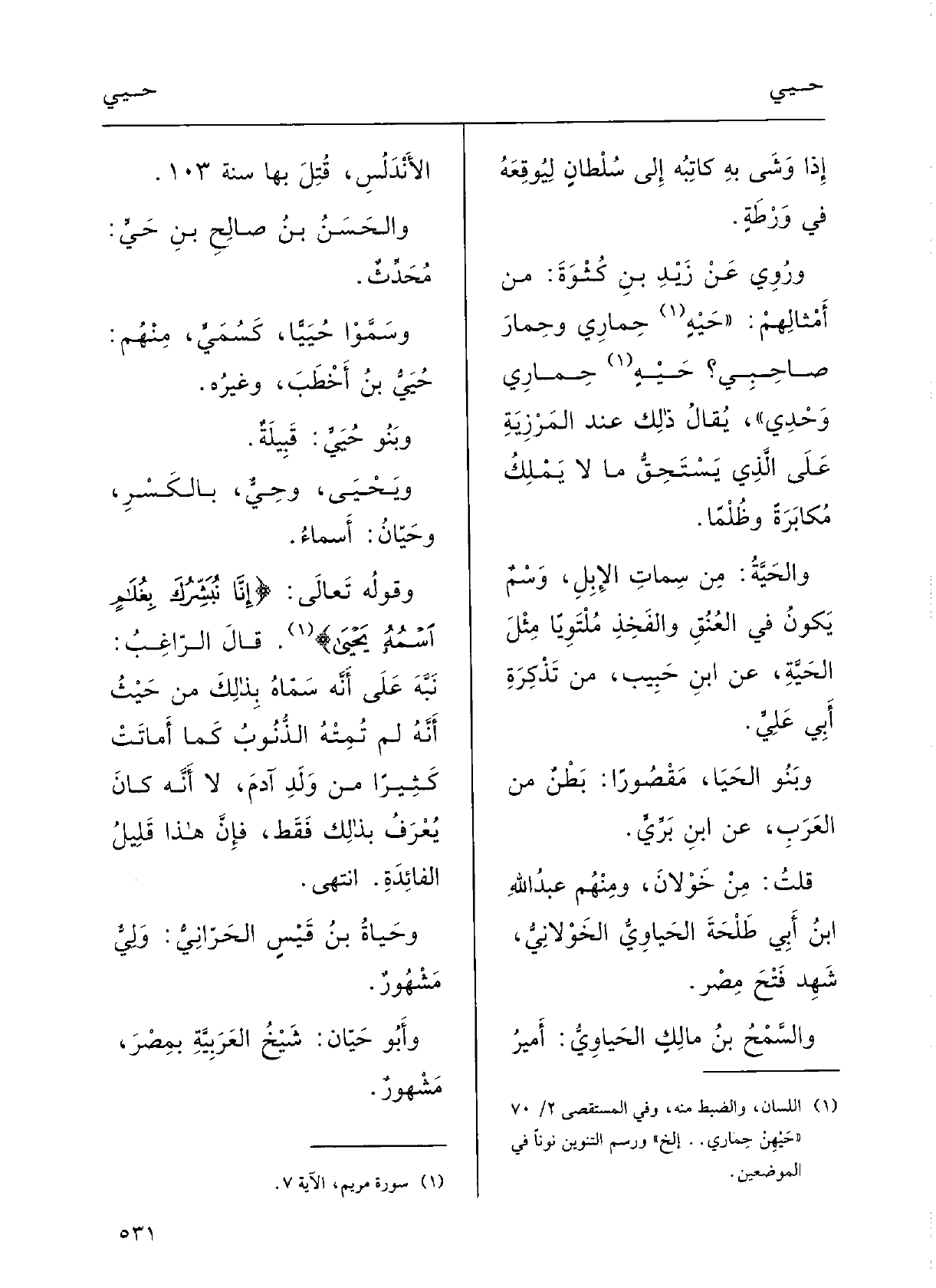 } ويَحْيَى {وحِيٌّ، بالكسْرِ،} وحَيَّان: أَسْماءٌ؛ وقوْلُه تَعَالَى: {إنَّا نُبَشِّرُكَ بغُلامٍ اسْمُه {يَحْيَى} .