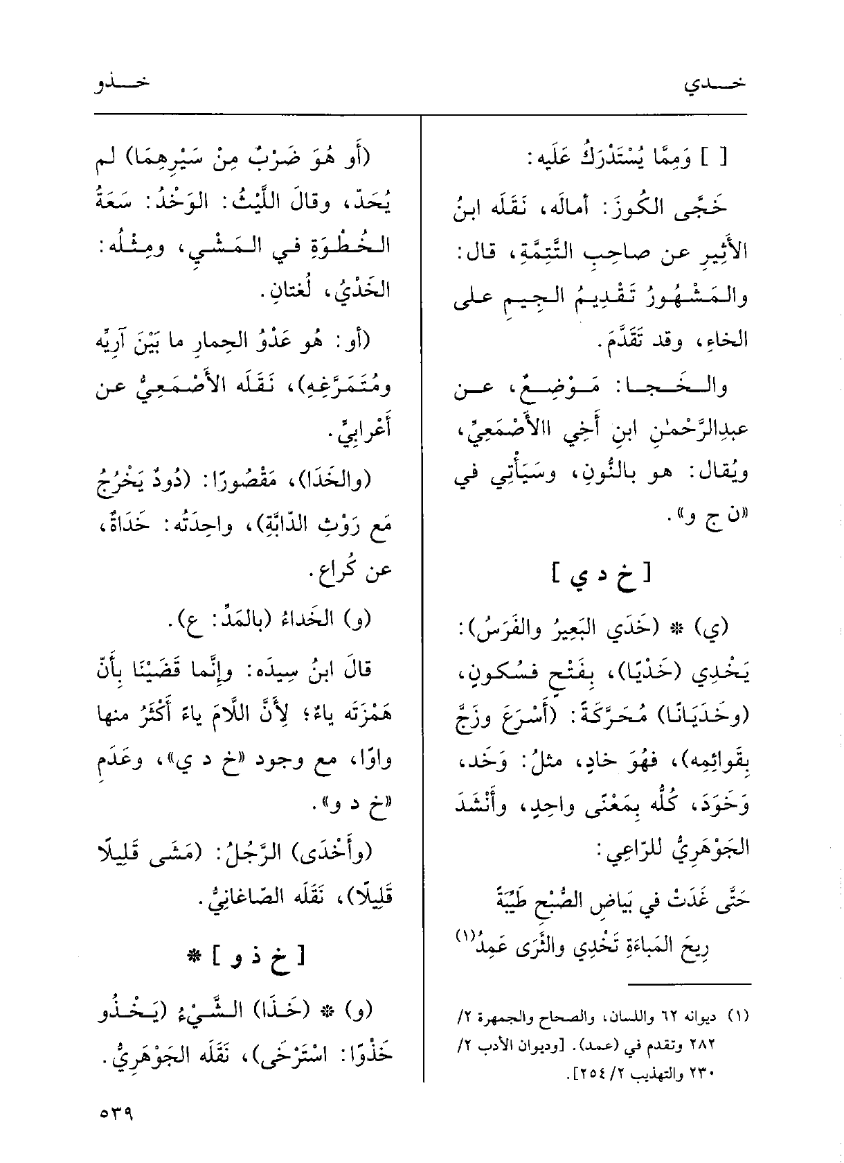 قالَ ابنُ سِيدَه: وإنَّما قَضَيْنا بأنَّ هَمْزَته ياءٌ لأنَّ اللامَ ياءٌ أَكْثَر مِنْهَا واواً مَعَ وُجُودِ خدي، وعَدَم خدو.
