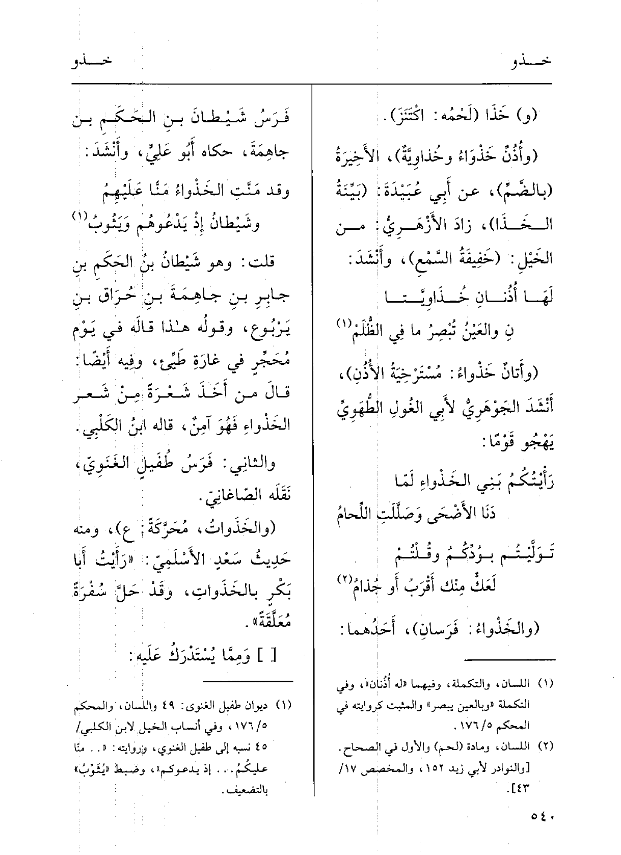 نِ والعَيْنُ تُبْصِرُ مَا فِي الظَّلَمْ (وأَتانٌ {خَذْواءُ: مُسْتَرْخِيَةُ الأُذُنِ) ؛ أَنْشَدَ الجَوْهرِيُّ لأبي الغُول الطُّهَويّ يَهْجو قَوْماً: