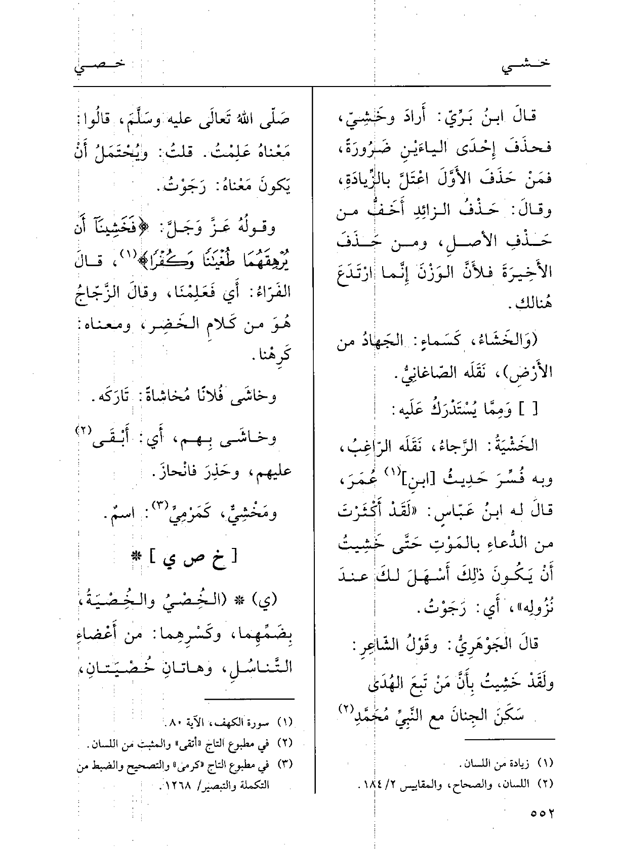 الخشْيَةُ: الرَّجاءُ؛ نَقَلَهُ الرَّاغبُ، وَبِه فَسَّر حدِيث عُمَر: (قالَ لَهُ ابنُ عباسٍ: لقد أَكْثَرْتَ مِن الدعاءِ بالمَوْتِ حَتَّى {خَشِيتُ أنْ يكونَ ذلكَ أَسْهَلَ لكَ عنْدَ نُزُولِه، أَي رَجَوْت؛