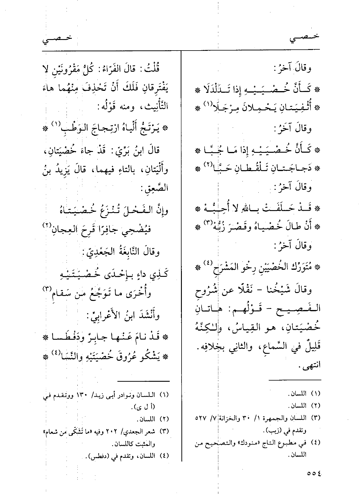 قالَ ابنُ برِّي: قد جاءَ خُصْيَتان وأَلْيتانِ بالتاءِ فيهمَا؛ قالَ يزيدُ بنُ الصَّعِق: