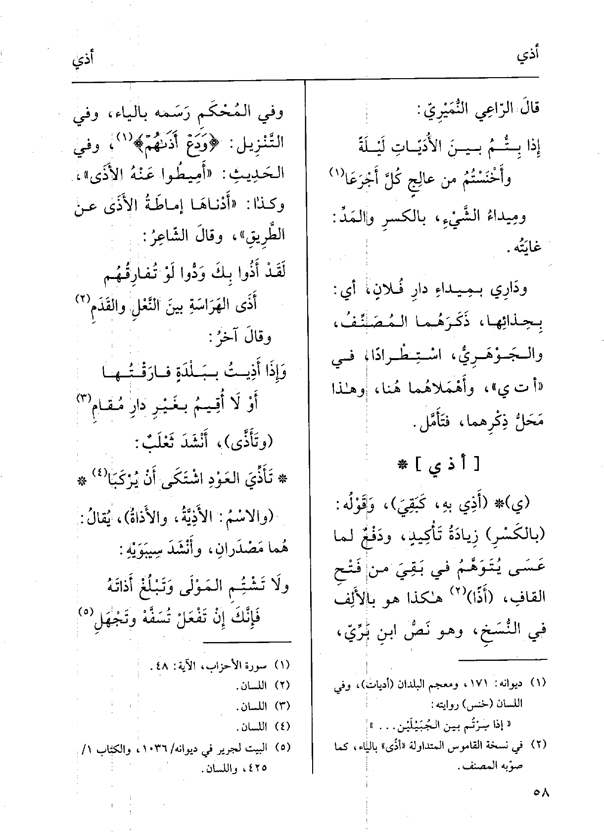 : (ي {أَذِيَ بِهِ، كبَقِيَ،) وقَوْلُه: (بالكسْرِ؛) زِيادَةُ تَأْكيدٍ ودَفْع لمَا عَسى يَتَوهَّم فِي بقَى مِن فتْحِ القافِ، (} أَذاً،) هَكَذَا هُوَ بالالِفِ فِي النسخِ، وَهُوَ نصُّ ابنِ بَرِّي، وَفِي المُحْكَم رَسَمَه بالياءِ، وَفِي التَّنْزيلِ: {وَدَعْ {أَذَاهُم} .