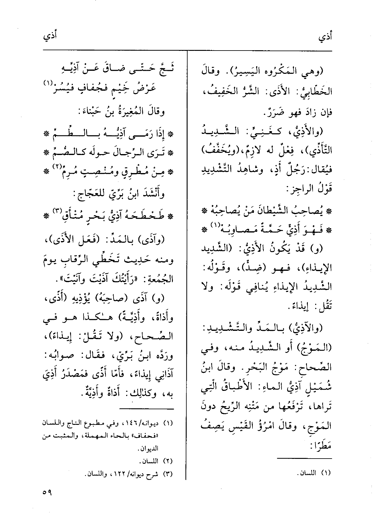 يُصاحِبُ الشَّيطانَ مَنْ يُصاحِبُه فَهْوَ} أَذيٌّ حَمَّةٌ مُصاوِبُه (وَقد يكونُ {الأَذِيُّ: (الشَّديدُ} الإِيذاءِ؛) فَهُوَ (ضِدٌّ.