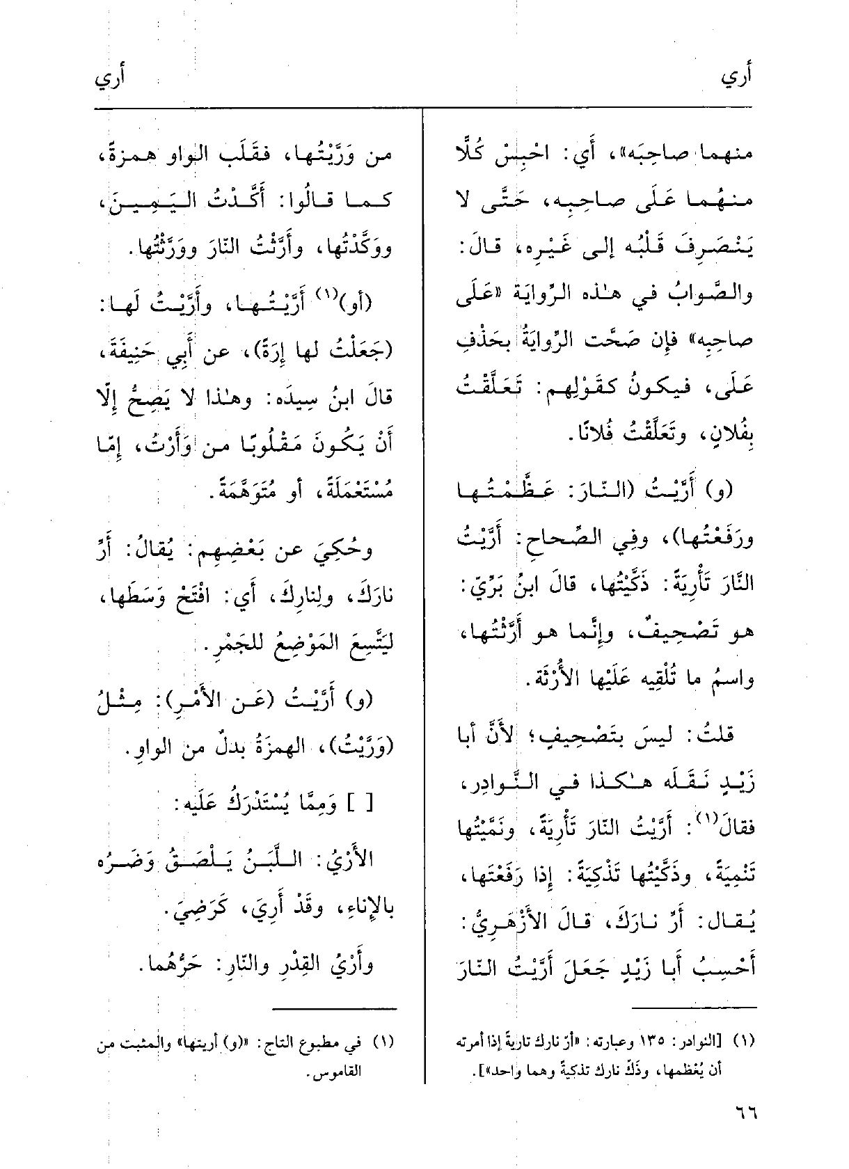 قُلْتُ: ليسَ بتَصْحيفٍ لأنَّ أَبا زيْدٍ نَقَلَهُ هَكَذَا فِي النَّوادِرِ فقالَ: أَرَّيْتُ النارَ تَأْرِيَةً ونَمَّيْتها تَنْمِيةً، وذَكَّيْتها تَذْكِيَةً إِذا رَفَعْتها. يقالُ: {أَرِّ نارَكَ.
