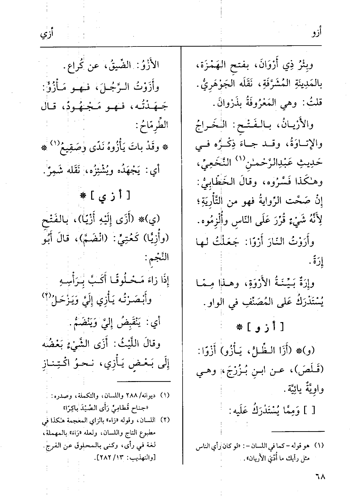 } الأَزْوُ: الضِّيقُ، عَن كُراعٍ {وأَزَوْتُ الرَّجُلَ فَهُوَ} مَأْزُوٌّ: جَهَدْته مَجْهودٌ؛ قالَ الطِّرمَّاحُ: