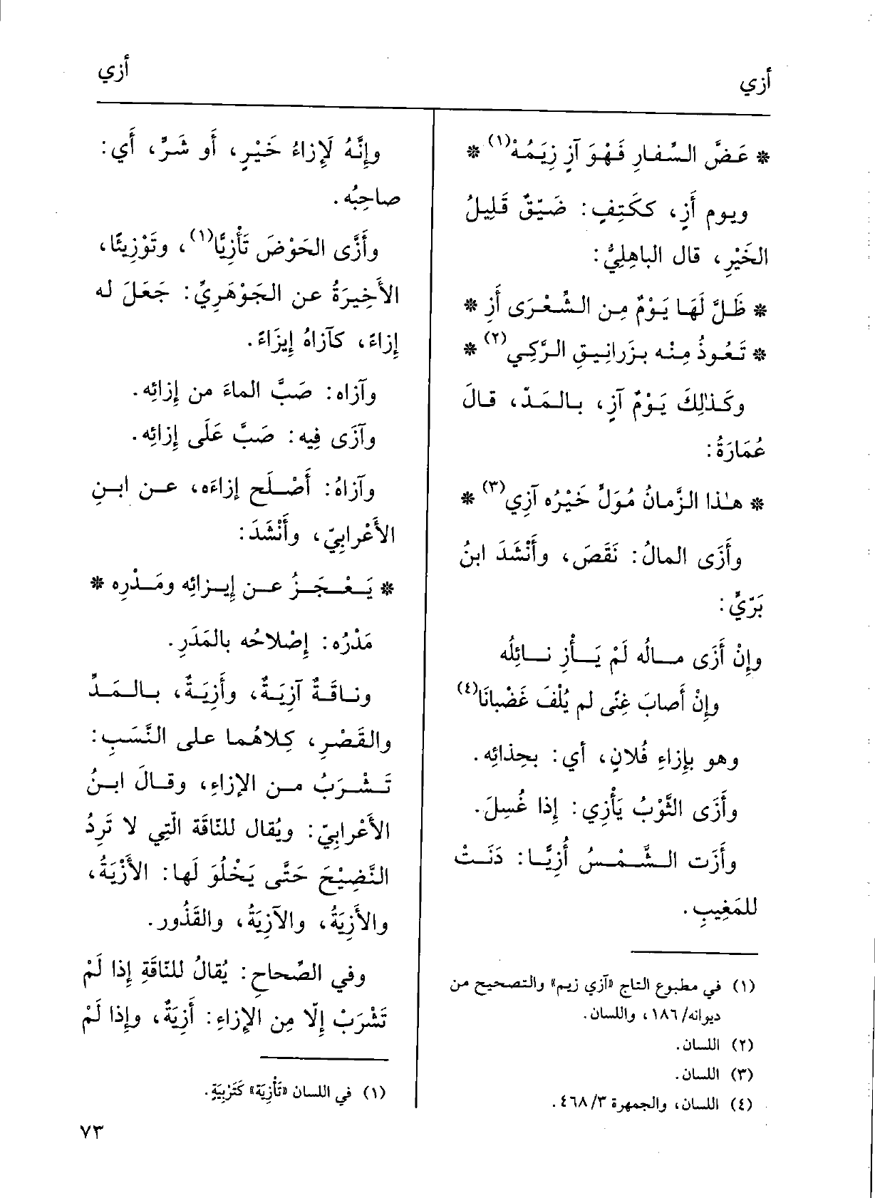غضّ الشّعارِ فَهُوَ آزِيّ زِيم ويَوْمٌ أَزِيٌّ، ككَتِفِ: ضَيِّقٌ قَليلُ الخَيْرِ؛ قالَ الباهِليُّ: