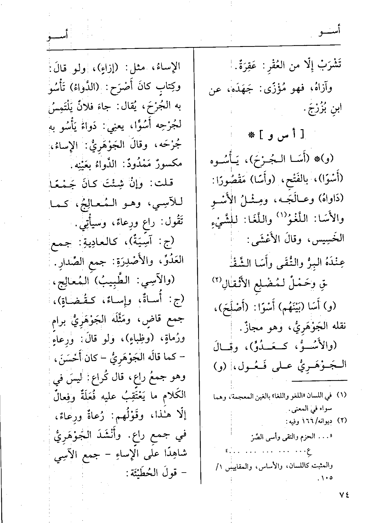 وأَنشَدَ الجَوْهرِيُّ شاهِداً على} الإسَاء جَمْع! الآسِي قَوْلَ الحُطَيْئة: