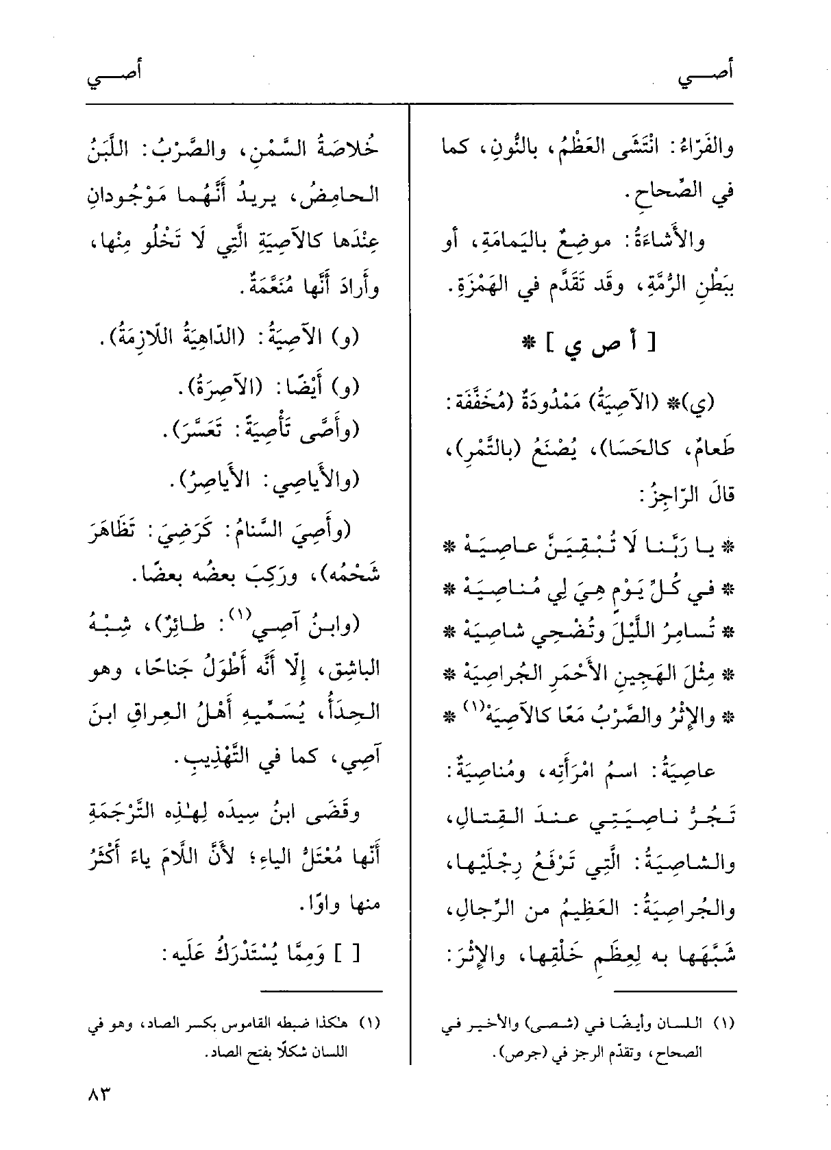 يَا رَبَّنا لَا تُبْقِيَنَّ عاصِيَه فِي كلِّ يَوْمٍ هِيَ لي مُناصِيَه تُسامِرُ اللَّيلَ وتُضْحي شاصِيَه مثل الهَجِينِ الأَحْمرِ الجُراصِيَه والإِثْر والصَّرْب مَعًا} كالآصِيَه عاصِيَةُ: اسمُ امْرَأَتِهِ، ومُناصِيَة: تَجُرُّنا ناصِيَتي عنْدَ القِتالِ، والشاصِيَةُ: الَّتِي تَرْفَعُ رِجلَيْها، والجُراصِيَة: العَظيمُ مِن الرِّجالِ، شَبَّهها بِهِ لعِظَم خَلْقها، والإِثْرُ: خُلاصَةُ السَّمْن، والصَّرْب: اللَّبَنُ الحامِضُ، يُريدُ أنَّهما مَوْجُودَانِ عنْدَها كالآصِيَةِ الَّتِي لَا تَخْلو مِنْهُمَا، وأَرادَ أنَّها مُنَعَّمَة.