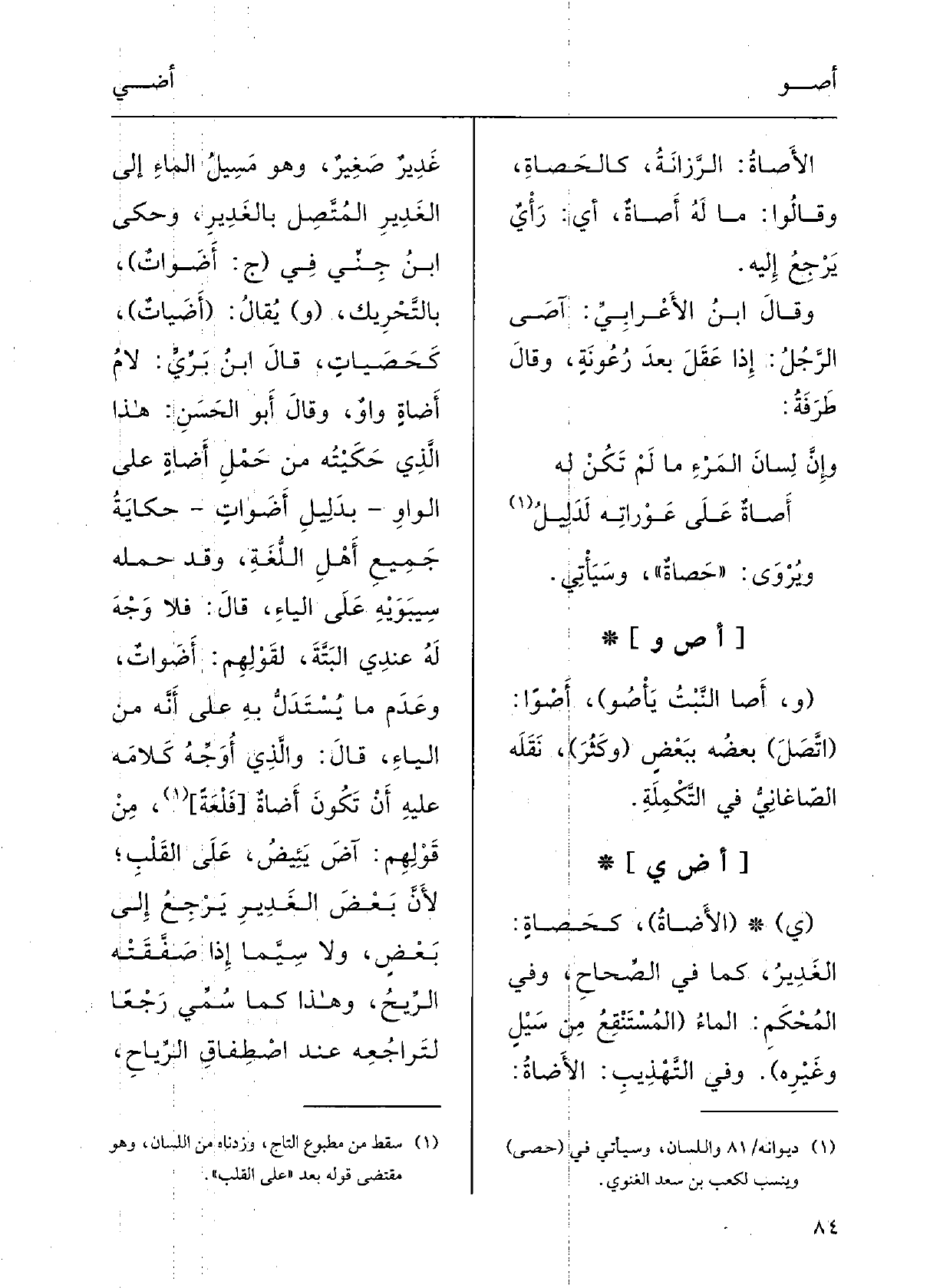 وقالَ أَبو الحَسَنِ: هَذَا الَّذِي حَكَيْته مِن حَمْل أضاة على الواوِ بدَلِيلِ أَضَوات حكايَةُ جَمِيعِ أَهْلِ اللّغةِ، وَقد حَمَلَه سِيْبَوَيْه على الياءِ، قالَ: فَلَا وَجْه لَهُ عنْدِي البَتَّة لقَوْلِهم أَضَوات، وعَدَم مَا يُسْتَدلُّ بِهِ على أنَّه من الياءِ، قالَ: وَالَّذِي أُوَجِّه كَلامَه عَلَيْهِ أنْ تكونَ أضَاة من قوْلِهم: آضَ يَئِيضُ، على القَلْبِ، لأنَّ بعضَ الغَديرِ يَرْجِعُ إِلَى بعضٍ وَلَا سيَّما إِذا صَفَقَتْه الرِّيحُ، وَهَذَا كَمَا سُمِّيَ رَجْعاً لتَراجُعِه عنْد اصْطِفاقِ الرِّياح.