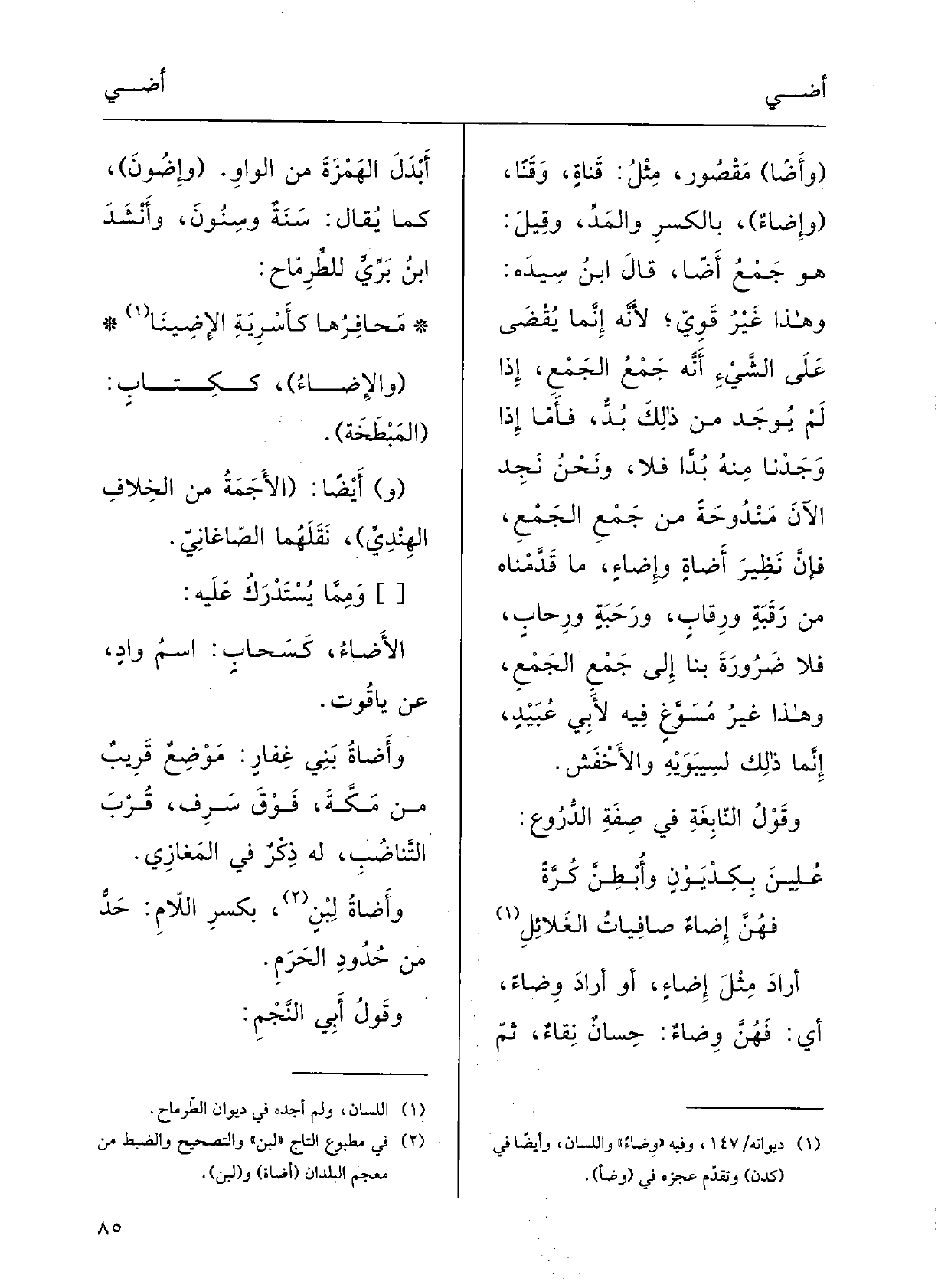 وزَعَمَ أَبو عبيدٍ أنَّ أَضاً جَمْع أَضاةٍ، وإضاءً جَمْع أَضاً.