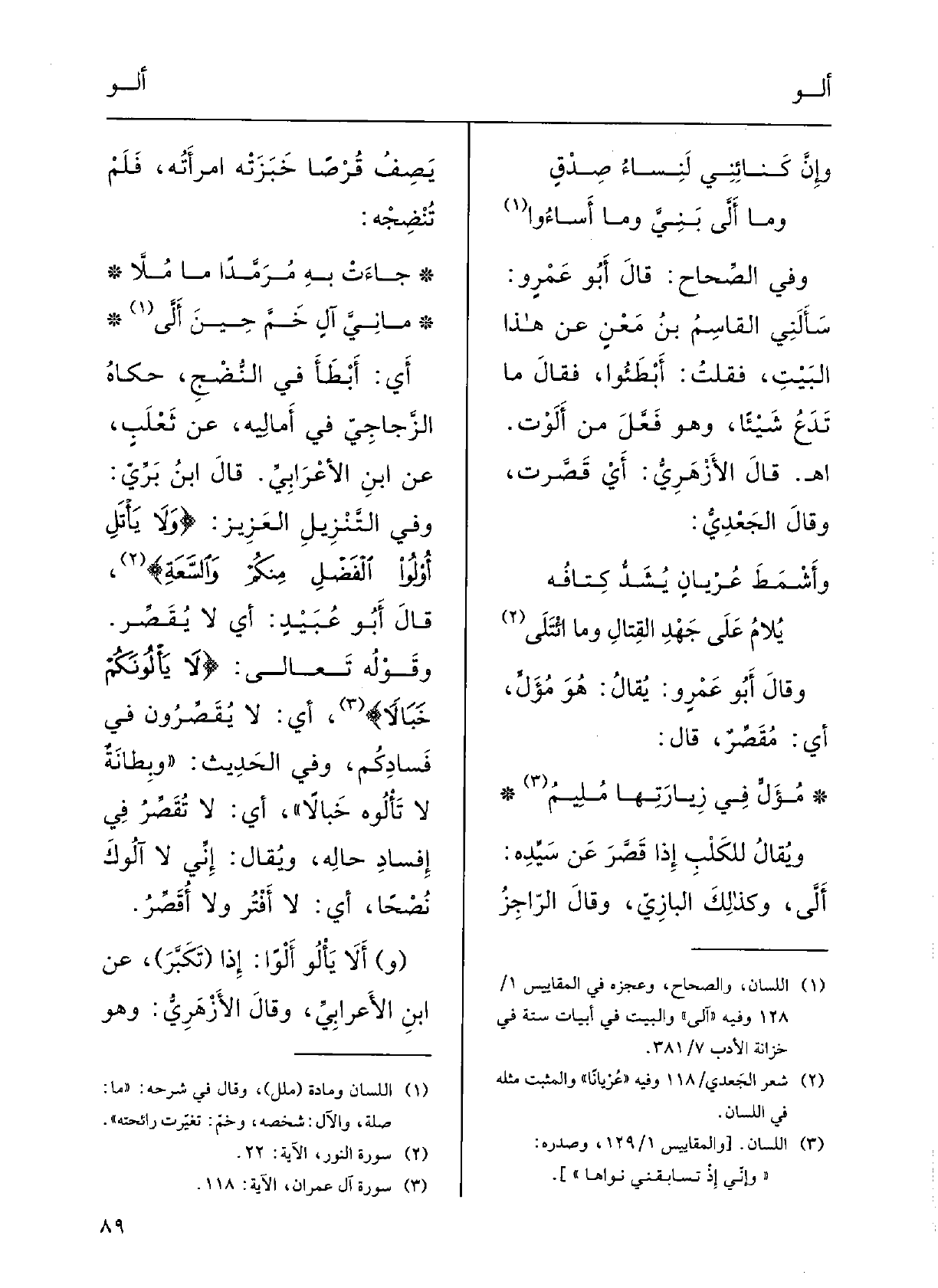 مُؤَلَ فِي زِيارَتِها مُلِيم ويقالُ للكَلْبِ إِذا قَصَّر عَن سيدِهِ:} أَلَّى؛ وكَذلِكَ البَازِي؛ وقالَ الرَّاجزُ يصِفُ قُرْصاً خَبَزَتْه امْرأَتُهُ فَلم تُنْضجْه: