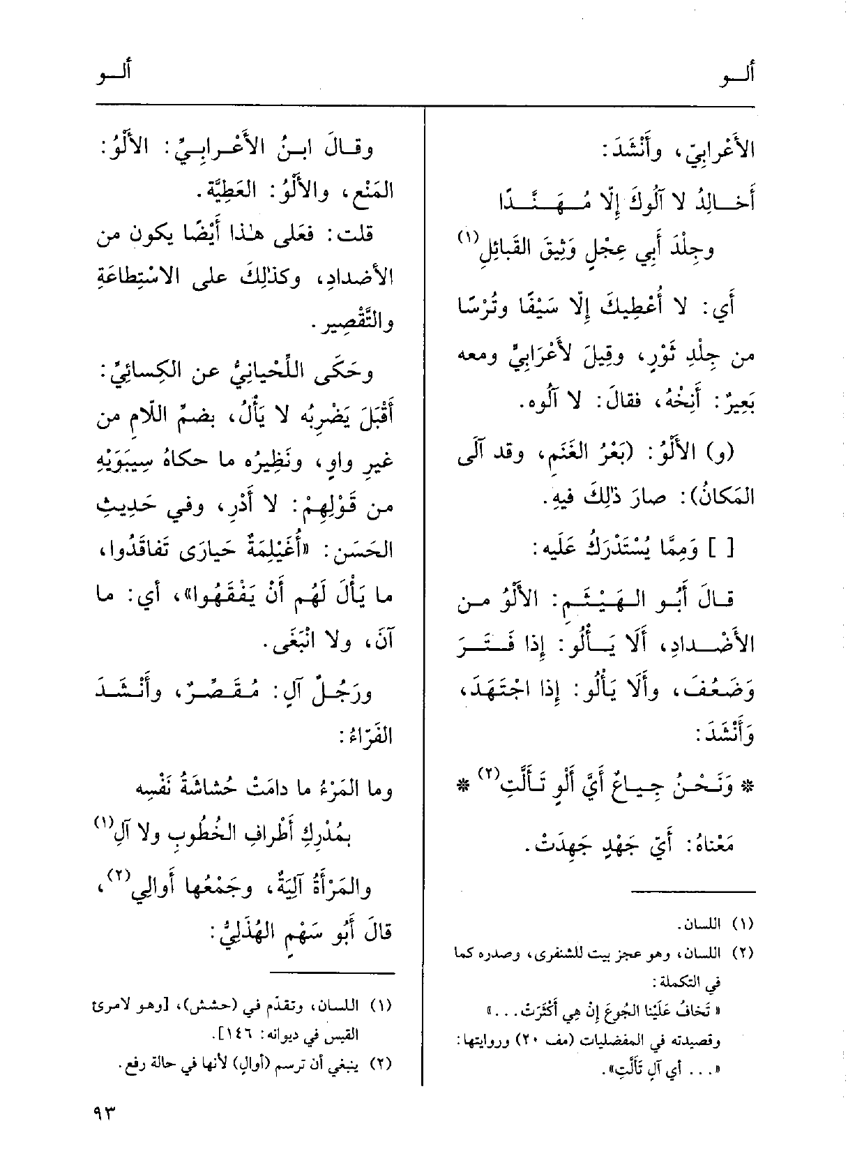 قالَ أَبو الهَيْثم: الأَلْوُ مِن الأَضْدادِ؛ أَلا يَأْلُو إِذا فَتَرَ وضَعُفَ، وأَلا} يَأْلُو إِذا اجْتَهَدَ؛ وأَنْشَدَ: