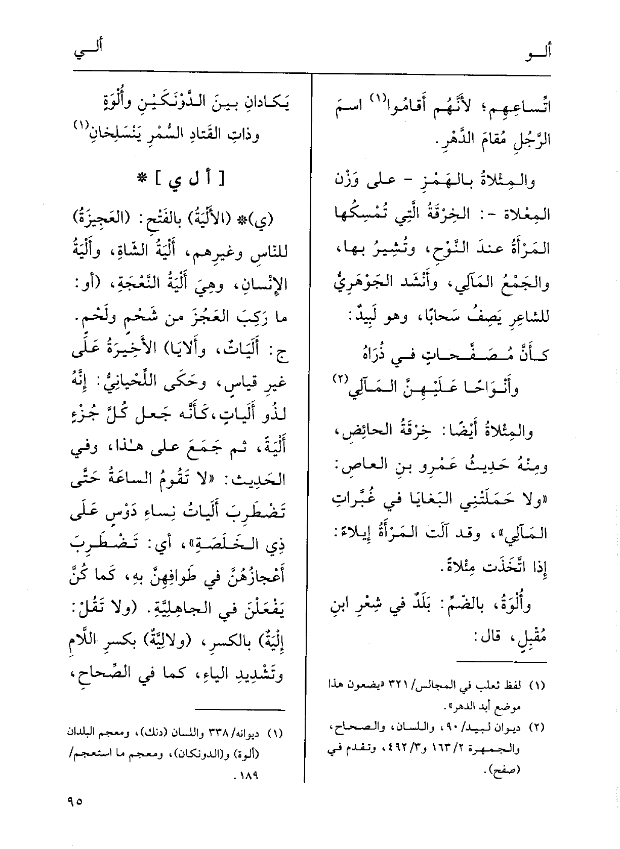 : (ي} الألْيَةُ) ، بالفتْحِ: (العَجيزَةُ) للنَّاسِ وغيرِهِم، {أَلْيَةُ الشاةِ} وأَلْيَةُ الإنْسانِ، وَهِي أَلْيَةُ النَّعْجةِ.