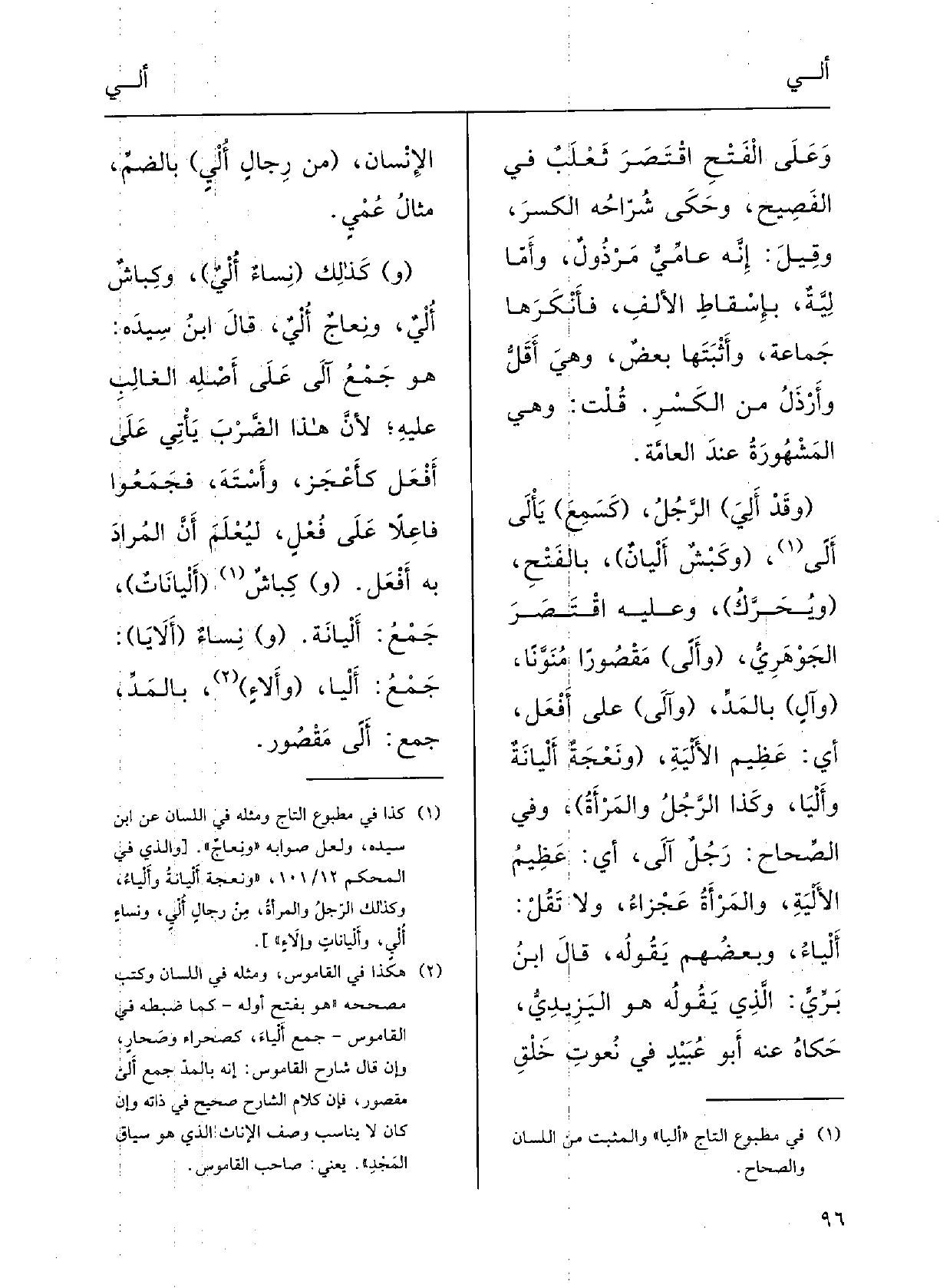 (مِن رِجالٍ {أُلْيٍ) ، بالضَّمِّ، مثَالُ عُمْي؛ (و) كَذلِكَ (نِساءٍ} أُلْيٍ) وكِباشٍ {أُلْيٍ ونِعاج} أُلْيٍ.