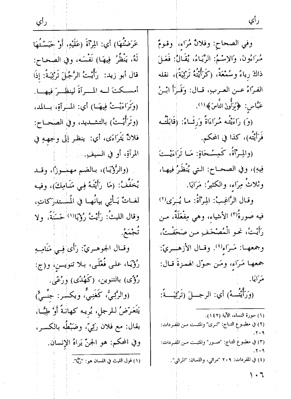 ( {كَرَأَّيْتُه} تَرْئِيَةً) ؛ نَقَلَهُ الفرَّاء عَن العَرَبِ، قالَ: وقَرَأ ابنُ عبَّاس: {يرأون النَّاس.