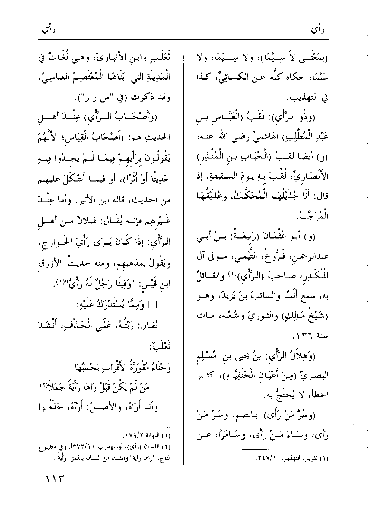 وأَمَّا عنْدَ غيرِهم فإنَّه يقالُ: فلانٌ من أَهْلِ الرَّأْي إِذا كانَ} يَرَى رَأْيَ الخوارِجِ ويقولُ بمَذْهَبِهم؛ وَمِنْه حدِيثُ الأَزْرَق بنِ قَيْس: (وفِينا رجُلٌ لَهُ {رَأْيٌ) .