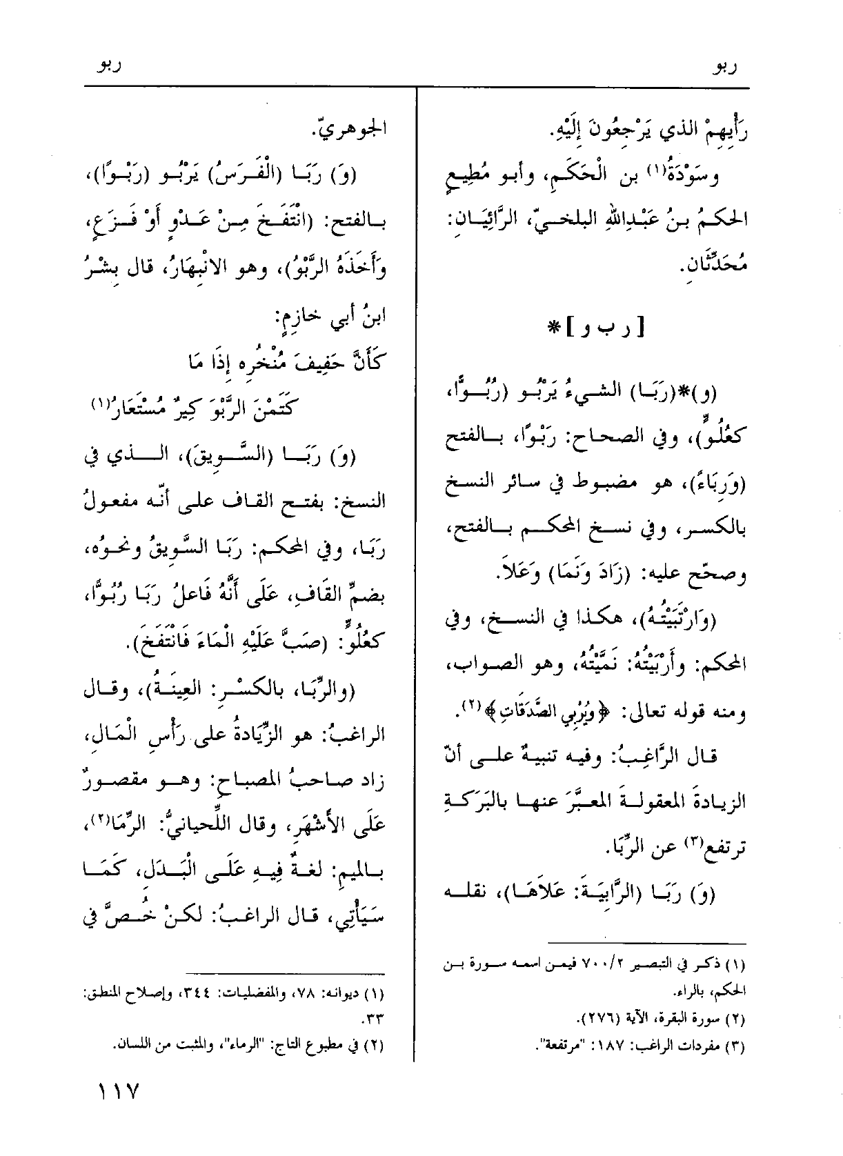 : (و ( {رَباَ) الشَّيءُ} يَرْبُو ( {رُبُوّاً كعُلُوَ) ؛ وَفِي الصِّحاحِ:} رَبْواً بالفتْحِ؛ ( {ورِباءً) ؛ هُوَ مَضْبُوطٌ فِي سائِرِ النُّسخِ بالكسْسرِ، وَفِي نسخِ المُحْكَم بالفتحِ وَصحح عَلَيْهِ؛ (زادَ ونَمَا) وعَلا.