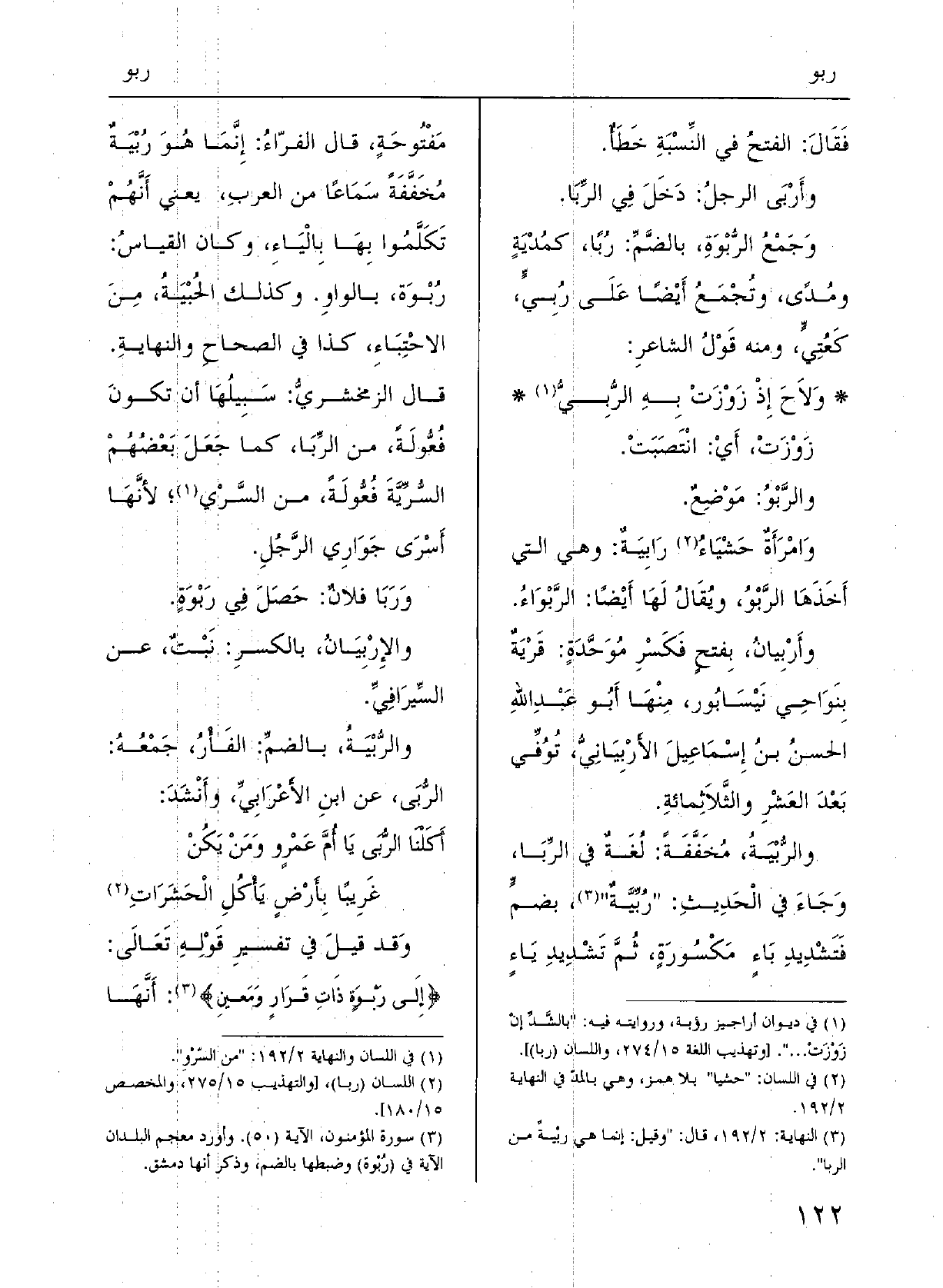 قالَ الفرَّاءُ: إنَّما هُوَ رُبْيَة مُخفَّفة سَمَاعا مِن العَرَبِ، يَعْني أنَّهم تكلَّموا بهَا بالياءِ، وَكَانَ القِياسُ رُبْوَة بِالْوَاو؛ وكَذلِكَ الحُبْيَة مِن الاحْتِباءِ؛ كَذَا فِي الصِّحاحِ والنهايَةِ.