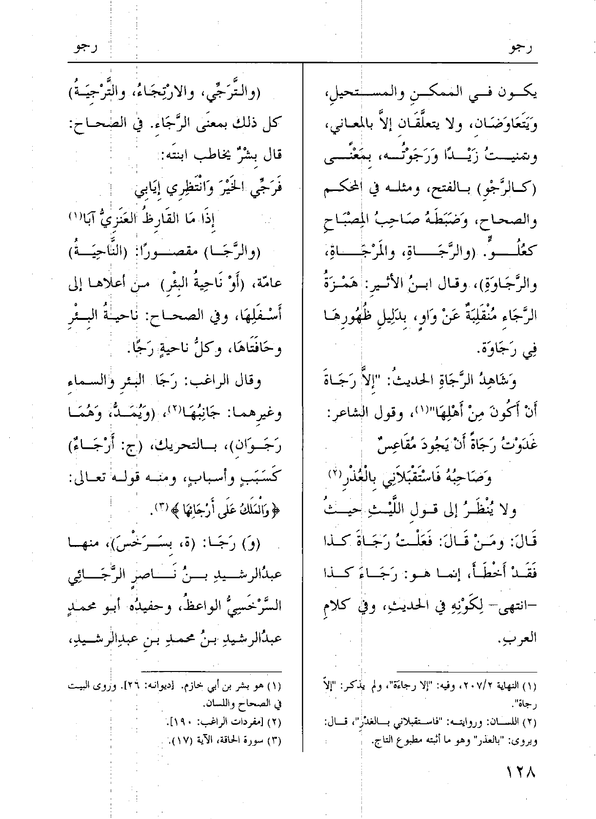 وقالَ ابنُ الأثيرِ: هَمْزةُ {الرَّجاءِ مُنْقَلِبَة عَن واوٍ بدَلِيلِ ظُهُورها فِي رَجاوَة؛ وشاهِدُ} الرَّجاةِ الحدِيثُ: (إلاَّ {رَجَاةَ أَنْ أَكُونَ مِن أَهْلِها) ، وقولُ الشاعِرِ: