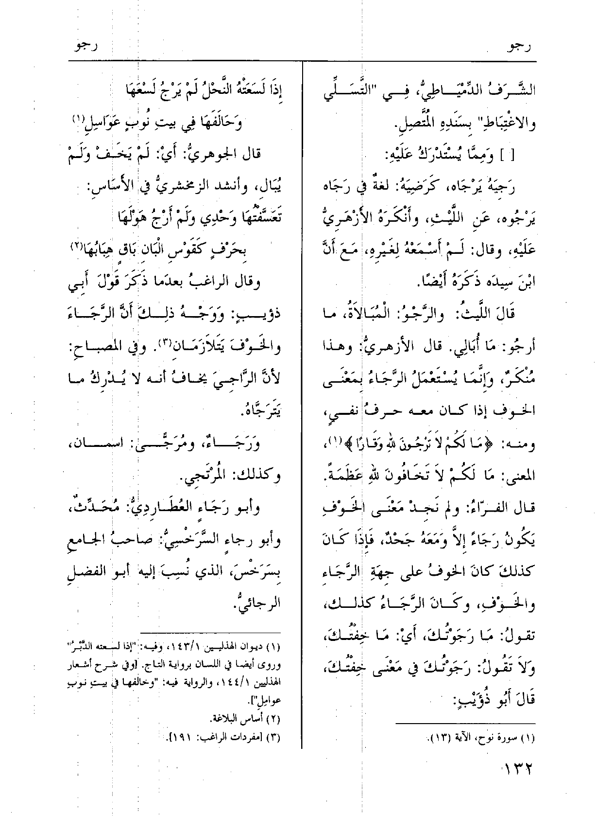 قالَ الأزْهريُّ: وَهَذَا مُنْكَرٌ وإنَّما يُسْتَعْمل الرَّجاء بمعْنى الخَوْف إِذا كانَ مَعَه حَرْف نفْي، وَمِنْه {مَا لَكُم لَا {تَرْجُونَ للَّهِ وَقاراً} ؛ المعْنَى: مَا لَكُم لَا تَخافُون للَّهِ عَظَمَة.