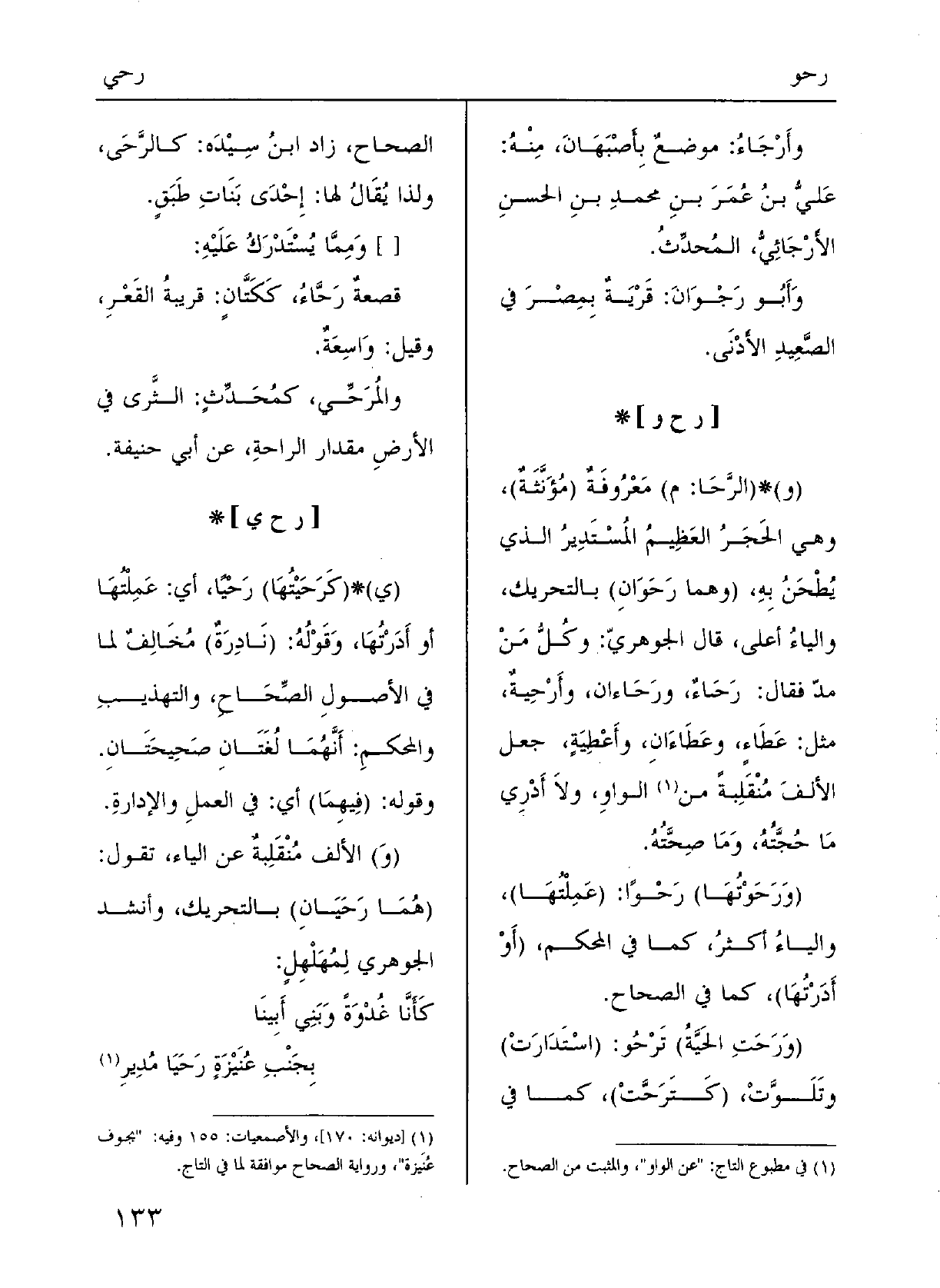: (ى {كرَحَيْتُها) } رَحْياً: أَي عَمِلْتُها أَو أَدَرْتُها؛ وقَوْلُه: (نادِرَةٌ) ، مُخالِفٌ لمَا فِي الأُصُولِ: الصِّحاح والتَّهْذِيب والمُحْكَم، إنَّهما لُغتانِ صَحِيحتانِ، وقَوْله: (فيهمَا) ، أَي فِي العَمَلِ والإِدارَةِ، (و) الأَلِفُ مُنْقلِبَة عَن الياءِ، تقولُ (هُما {رَحَيانِ) ، بالتَّحْريكِ، وأَنْشَدَ الجوهريُّ لمُهَلْهِل: