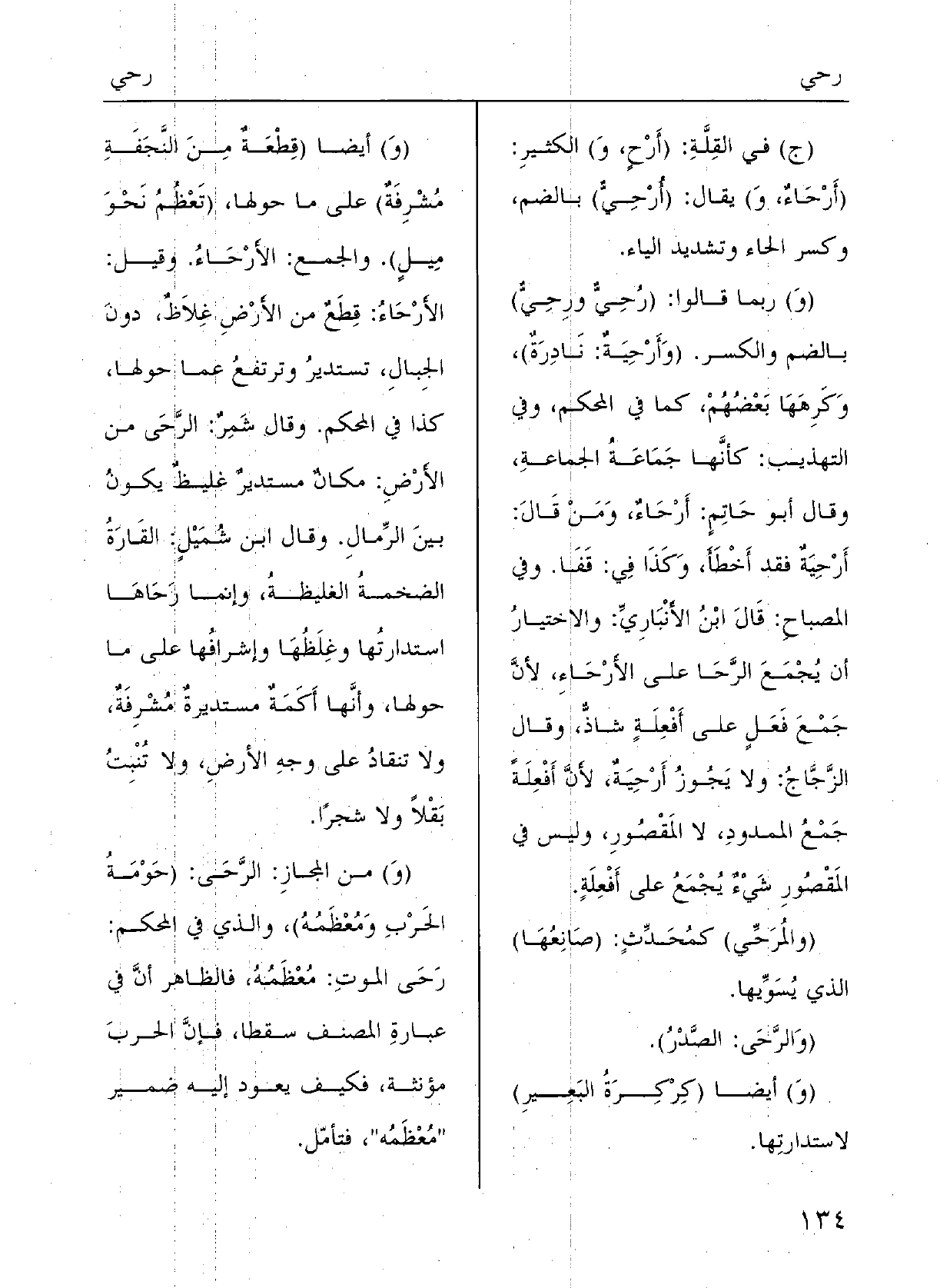 وقالَ شَمِرٌ: {الرَّحَى مِن الأرْضِ مَكانٌ مُسْتديرٌ غَلِيظٌ يكونُ بينَ الرِّمال.