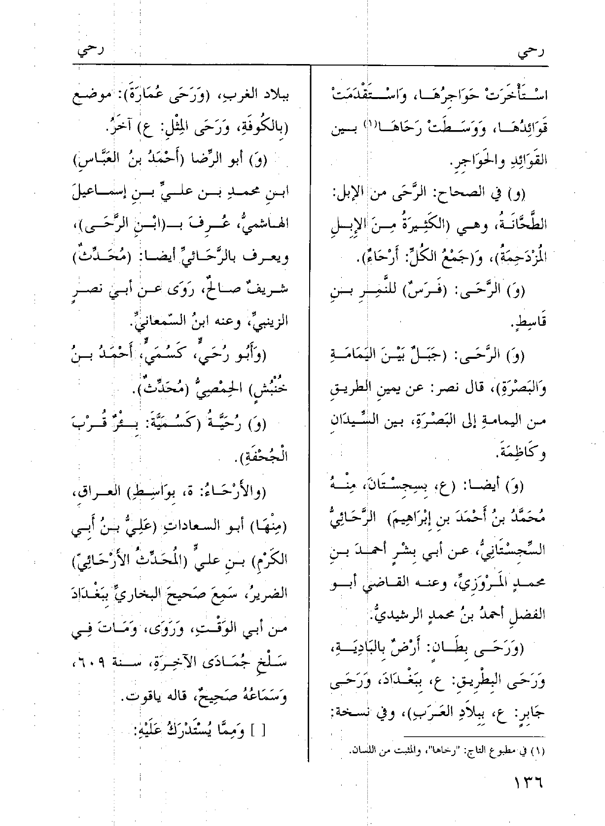 (} والأَرْحاءُ: ة بواسِطَ) العِراقِ، (مِنْهَا) : أَبو السَّعاداتِ (عليُّ بنُ أَبي الكَرْم) بنِ عليَ (المُحدِّثُ! الأَرْحائيُّ) الضَّرِيرُ سَمِعَ صَحِيحَ البُخارِي ببَغْدادَ مِن أَبي الوَقْت، ورَوَى وماتَ فِي سلخ جُمادَى الآخِرَةِ سَنَة 609، وسماعُه صَحِيحٌ، قالَهُ ياقوت.