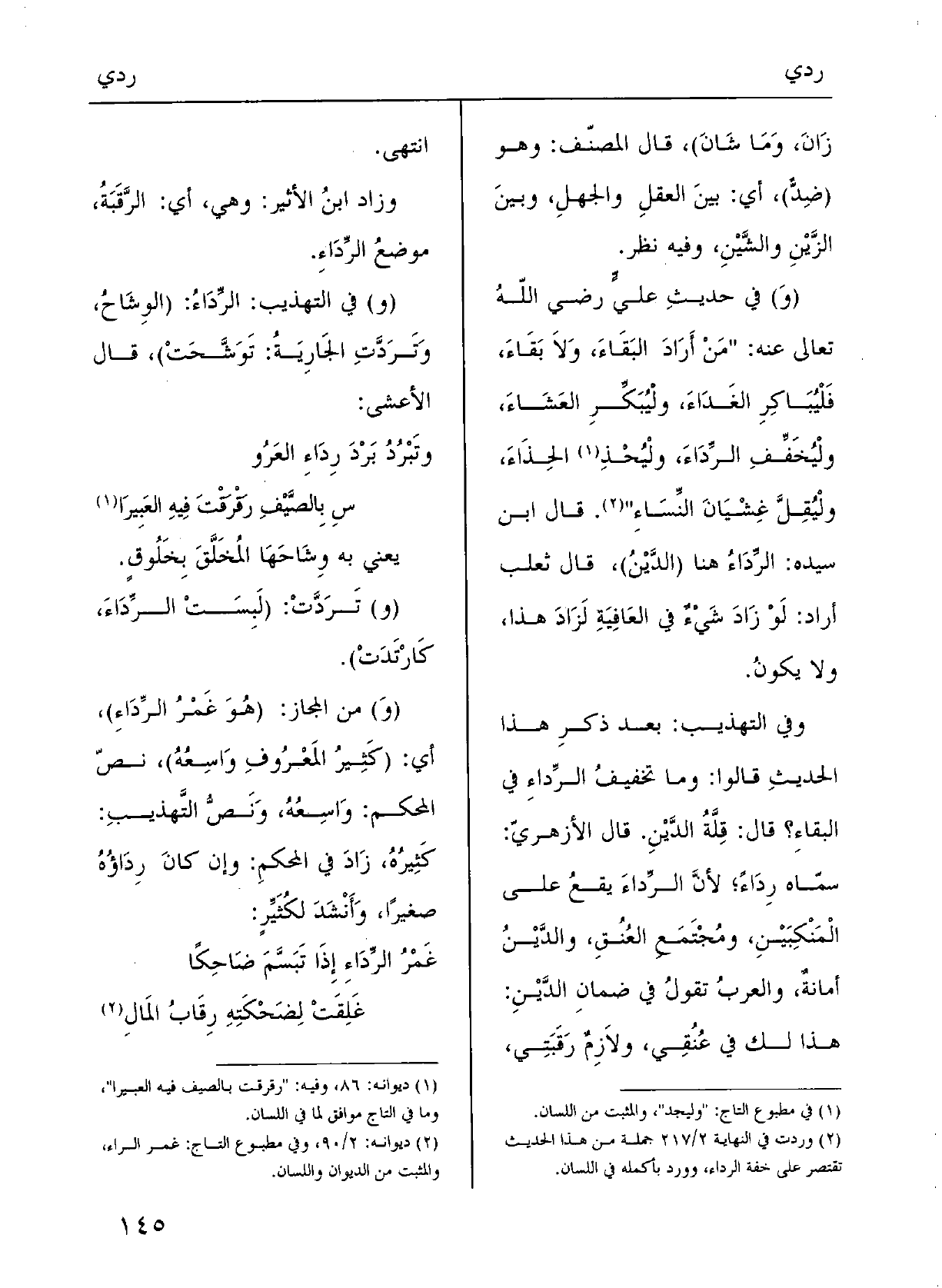 قالَ الأَزْهرِيُّ: سَمَّاه رِداءً لأنَّ الرِّداءَ يَقع على المَنْكِبَيْن ومُجْتَمَعِ العُنُقِ، والدَّيْنُ أَمانَةٌ، والعَرَبُ تقولُ فِي ضمانِ الدَّيْن هَذَا لكَ فِي عُنُقِي ولازِمٌ رَقَبَتي، انتَهَى.