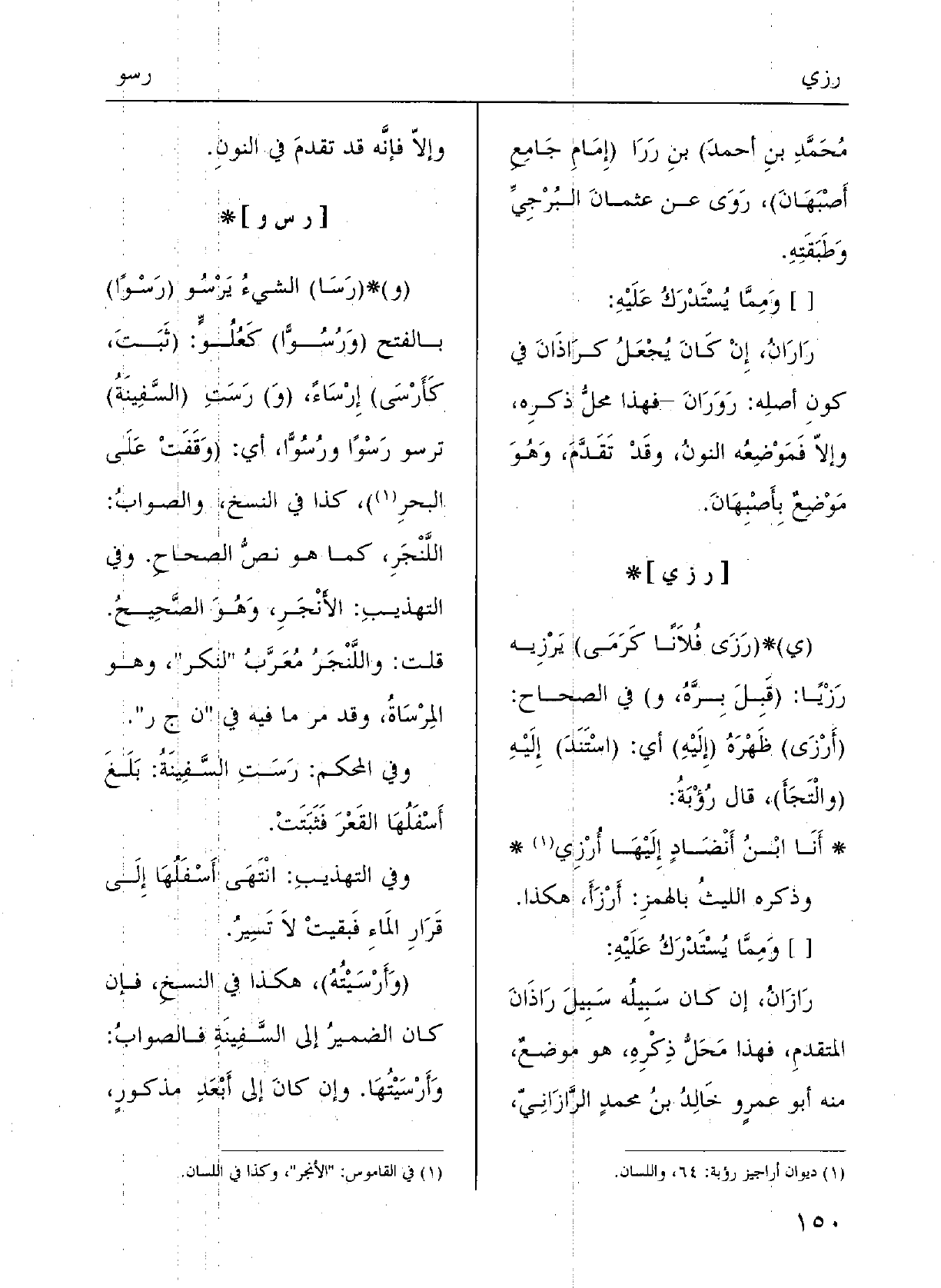 } رَارَان: إنْ كانَ يُجْعَل كرَاذَان فِي كَوْنِ أَصْله {رَوَران، فَهَذَا مَحلُّ ذكْرهِ، وإِلاَّ فموْضِعُه النّون، وَقد تقدَّم؛ وَهُوَ مَوْضِعٌ بأَصْبَهان