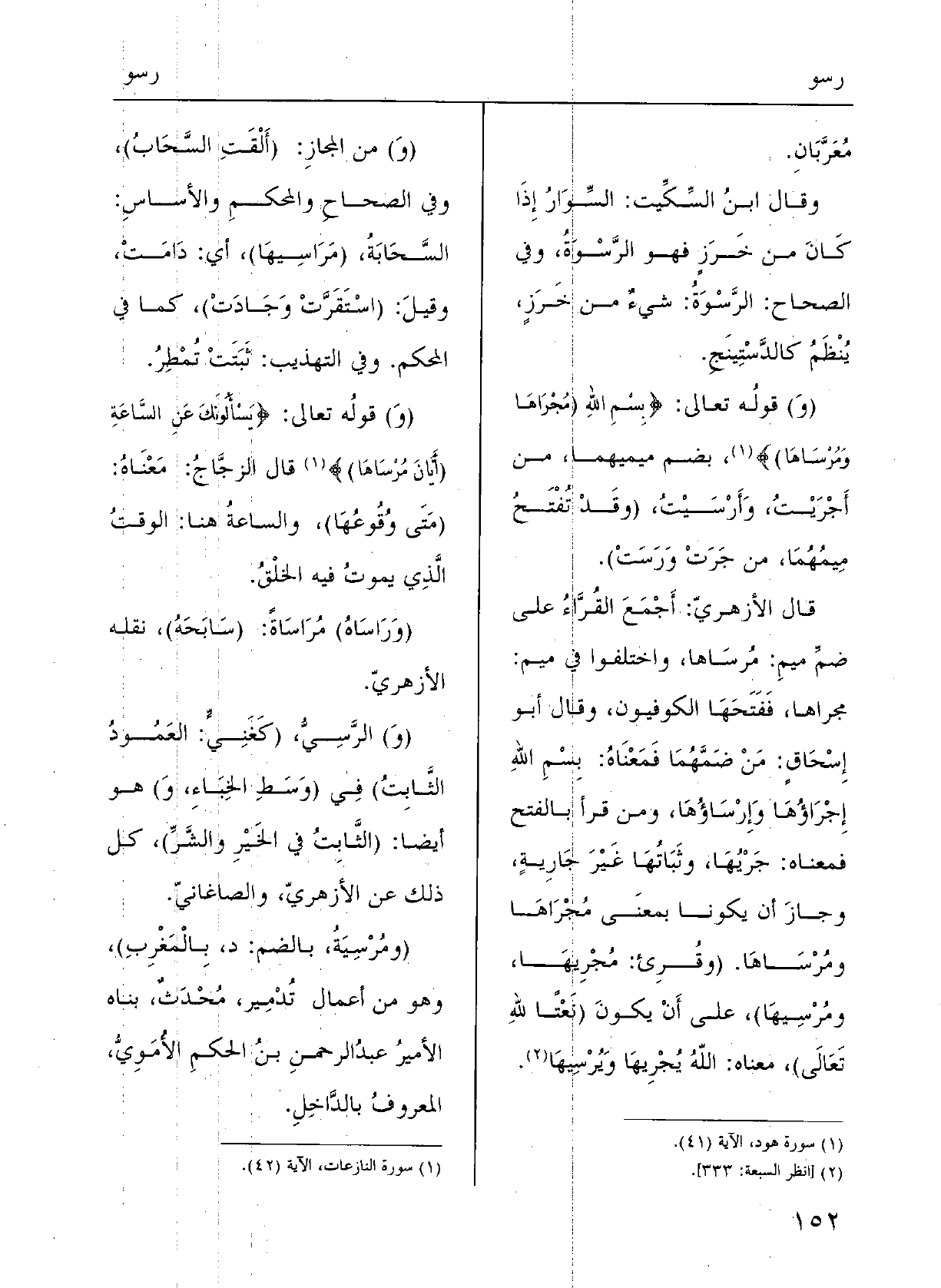 قالَ الأزْهرِيُّ: أَجْمَعَ القرَّاءُ على ضمِّ مِيمِ} مُرْساها، واخْتَلَفُوا فِي مِيمِ مُجْراها، ففَتَحها الكُوفيُّون.