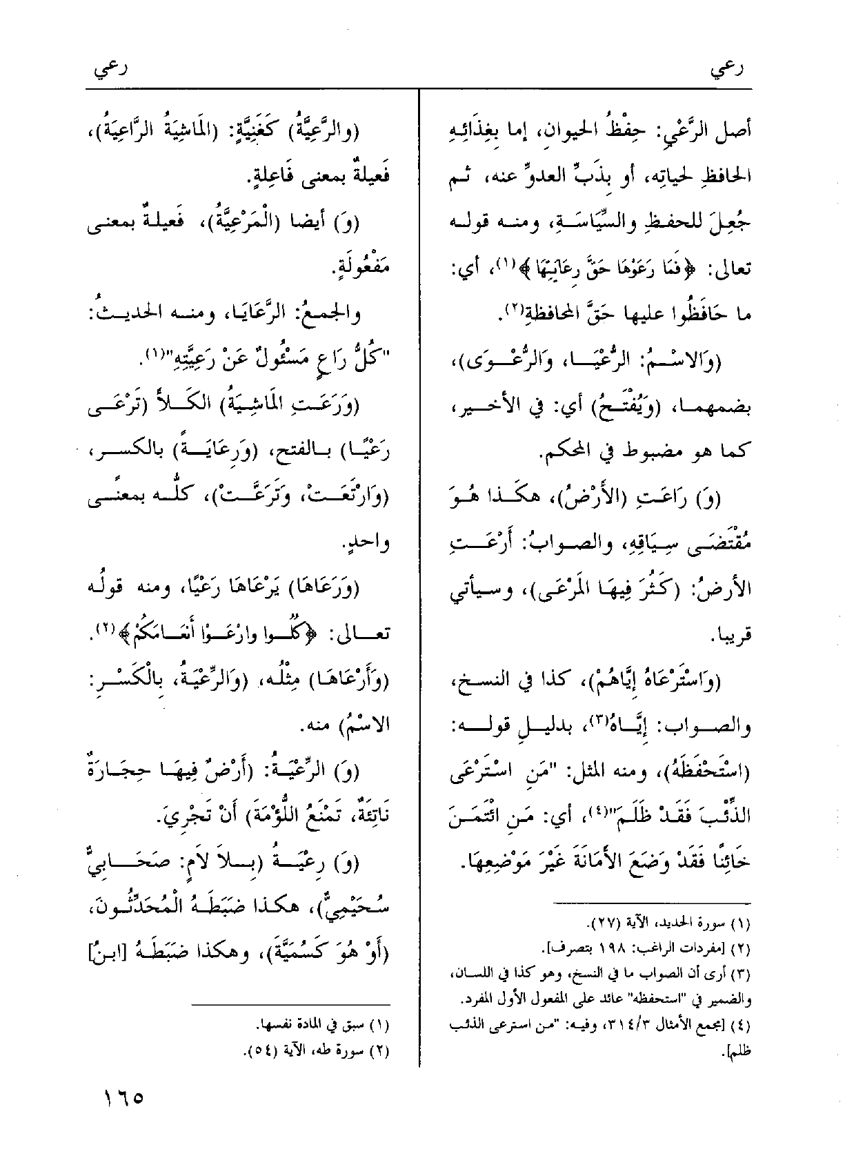 أَصْلُ {الرّعْي حفْظُ الحَيَوانِ إمَّا بغِذائِهِ الحافِظِ لحَياتِه، أَو بذبِّ العَدُوِّ عَنهُ، ثمَّ جُعِلَ للحفْظِ والسِّياسَةِ؛ وَمِنْه قوْلُه تَعَالَى: {فَمَا} رعوها حَقّ {رِعايتِها} ، أَي مَا حافَظُوا عَلَيْهَا حَقّ المُحافَظَةِ؛