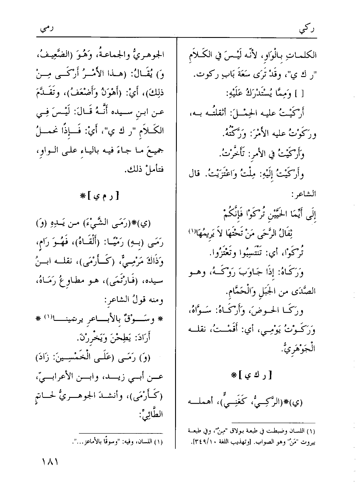 وتقدّمَ عَن ابنِ سِيدَه أنَّه قالَ ليسَ فِي الكَلامِ (رَ ك ي) ، أَي فَإِذا نَحْمِل جَمِيعَ مَا جاءَ فِيهِ بالياءِ على الواوِ فتأَمَّل ذلكَ.