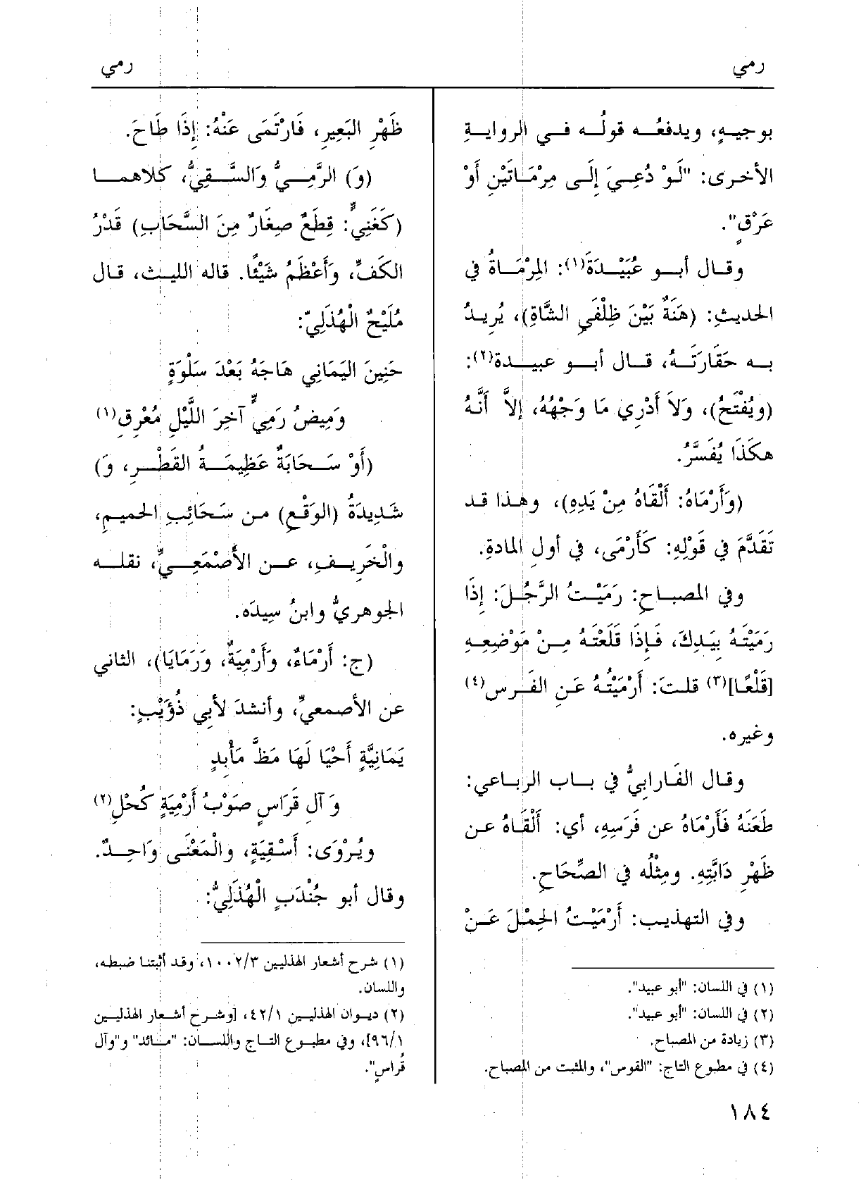 ومِيضُ رَمِيَ آخرَ اللَّيْلِ مُعْرِقِ (أَو سحابَةٌ عظيمَةُ القَطْرِو) شَدِيدَةُ (الوِقْعِ) مِن سَحائِب الحمِيمِ والخرِيفِ؛ عَن الأَصْمعيِّ نقلَهُ الجوهريُّ وابنُ سِيدَه؛ (ج {أَرْماءٌ} وأَرْمِيَةٌ! ورَمَايا) ؛ الثَّانِي عَن الأَصْمعيّ؛ وأَنْشَدَ لأبي ذُؤَيبٍ: