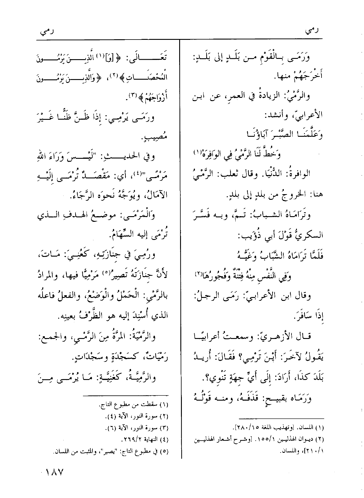 وَقَالَ ثَعْلَب: الرَّمْيُ هُنَا الخُرُوجُ مِن بلَدٍ إِلَى بلَدٍ.