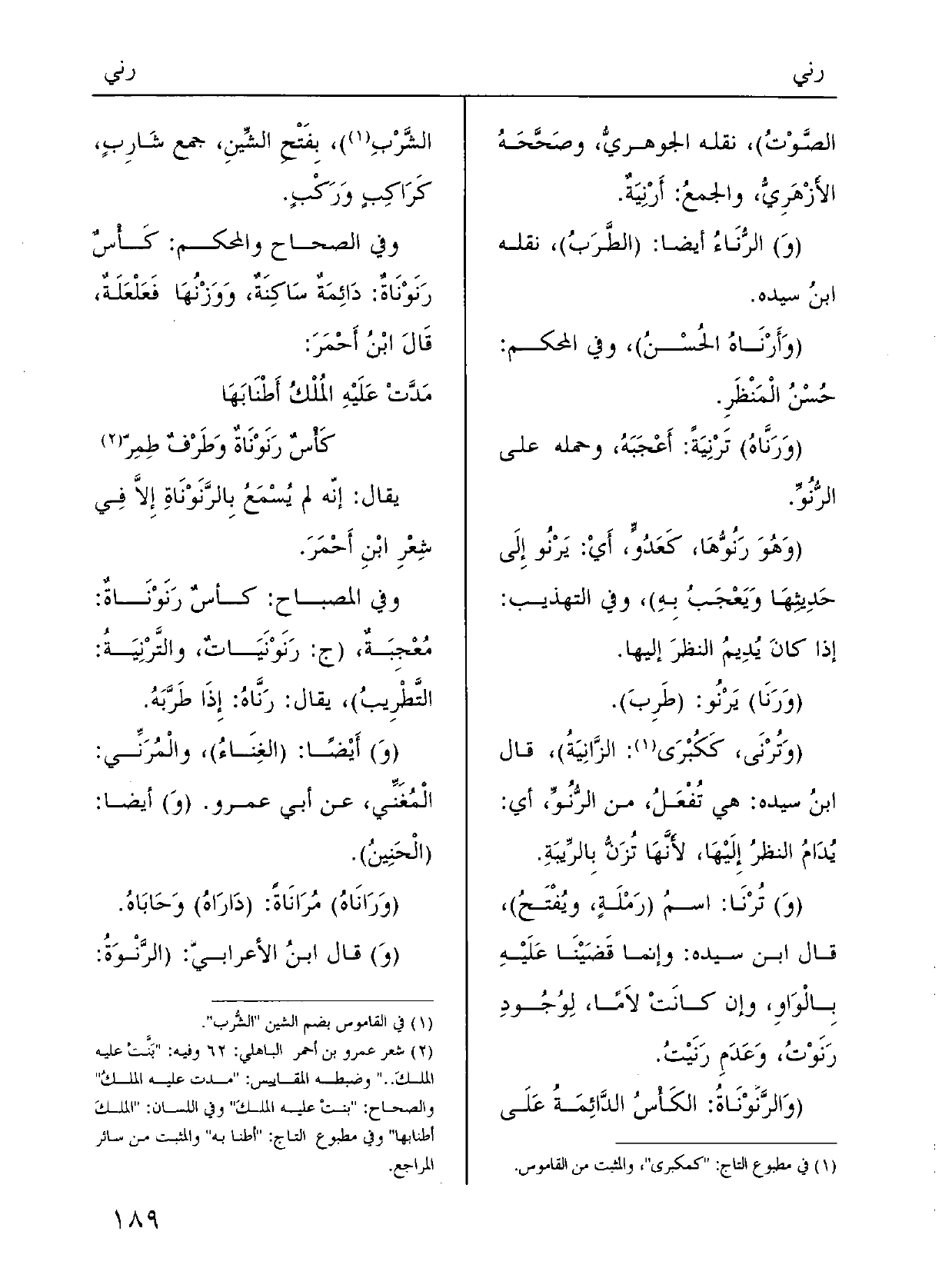 قالَ ابنُ سِيدَه: وإِنَّما قَضَيْنا عَلَيْهَا بالواوِ إِن كانتْ لاماً لوُجُودِ} رنَوْتُ وعَدَم رَنَيْت.