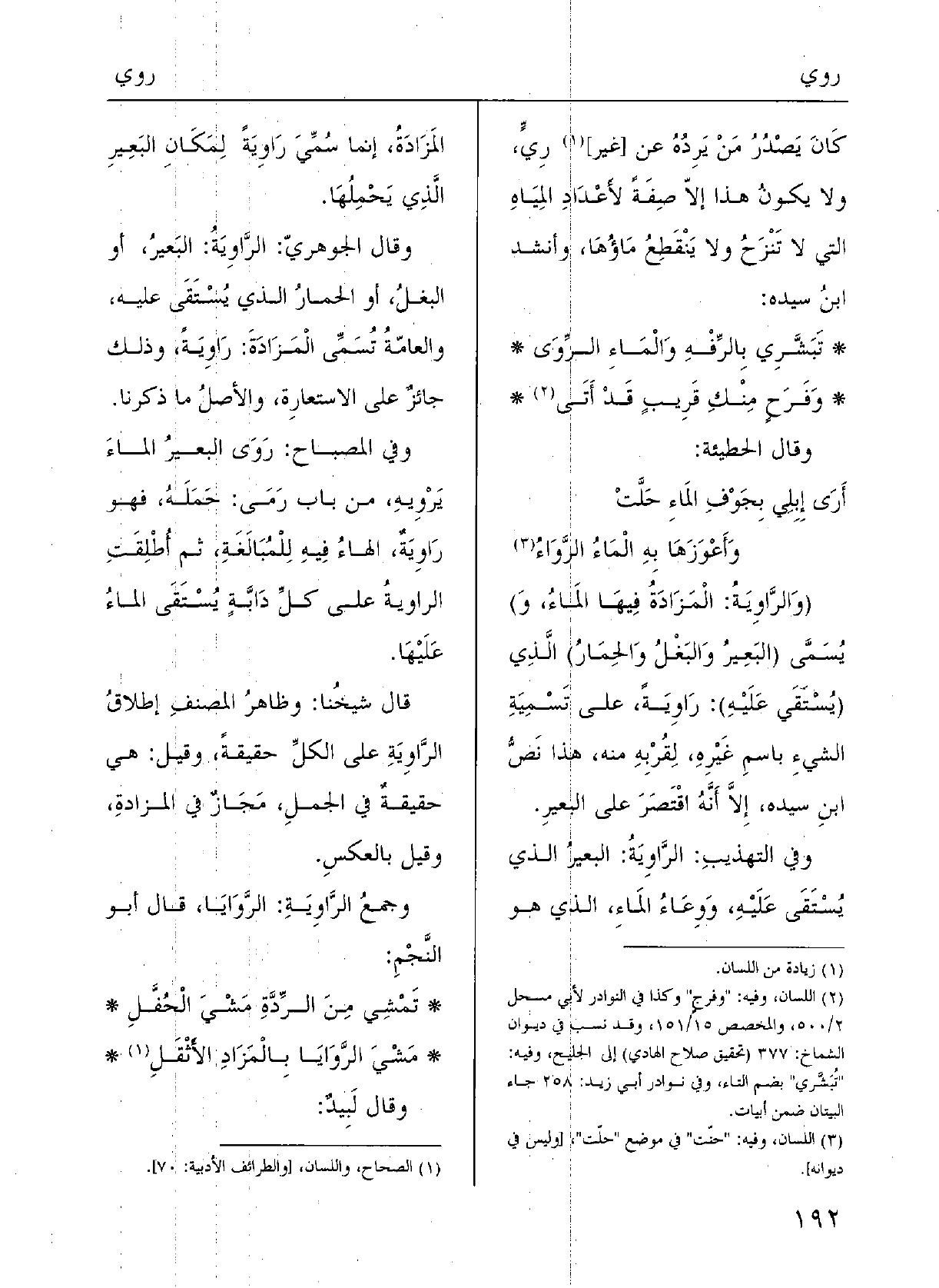 قَالَ شيْخُنَا وظاهِرُ المصنِّفِ إطْلاقُ الرَّاوِيَةِ على الكُلِّ حَقِيقَة، وقيلَ: هِيَ حَقيقةٌ فِي الجَمَلِ مَجازٌ فِي المَزادَةِ، وقيلَ بالعكْسِ، وجَمْعُ {الرَّاوِيَةِ} الرَّوايا، قالَ أَبُو النَّجْم: