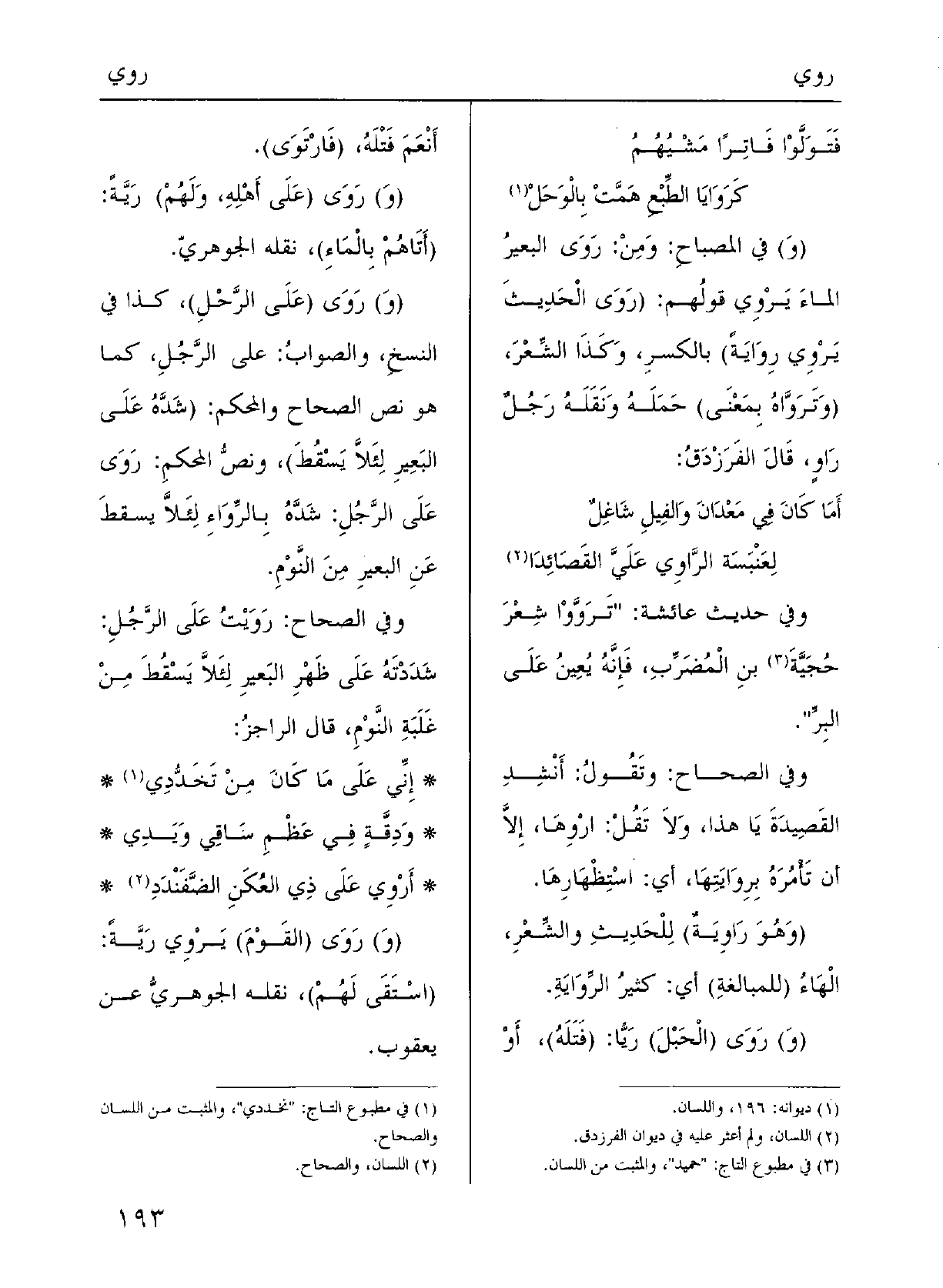 {كرَوايا الطّبْعِ هَمَّتْ بالوَحَلْ (و) فِي المِصْباح: ومِن رَوَى البَعيرُ الماءَ} يَرْوِي قَوْلهم: ( {رَوَى الحدِيثَ} يَرْوِي {رِوايَةً) بالكَسْرِ؛ وَكَذَا الشِّعْر.