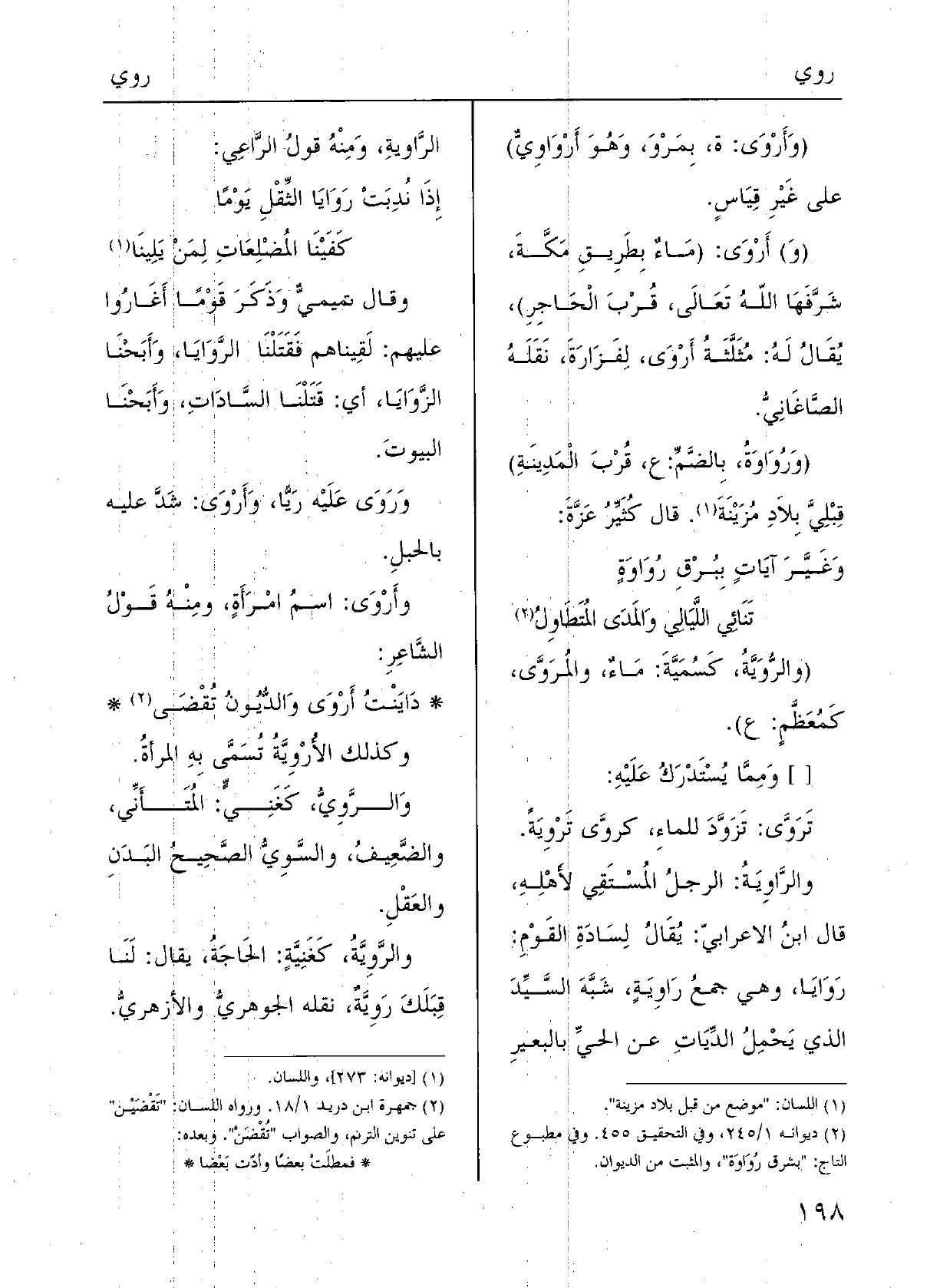 كَفَيْنا المُضْلِعاتِ لمَنْ يَلِيناوقالَ تَمِيمِيُّ وذَكَرَ قَوْماً أَغاروا عَلَيْهِم: لَقينَاهُم فقَتَلْنا} الرَّوايا وأَبَحْنَا الزَّوايا، أَي قَتَلْنا السَّادَات وأَبَحْنَا البُيوتَ ورَوَى عَلَيْهِ {رَيّاً وأَرْوَى: شَدَّ عَلَيْهِ بالحبْلِ.