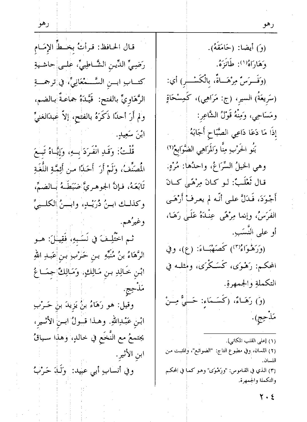 (و) } رَهاءُ، (كسَماءٍ: حيٌّ من مَذْحِجٍ) . قالَ الحافِظُ: قَرَأْتُ بخطِّ الإِمام رَضِيِّ الدِّيْن الشَّاطِبيّ على حاشِيَةِ كتابِ ابنِ السَّمعاني فِي ترجمةِ {الرَّهاوي، بالفتْحِ، قَيَّده جماعَةٌ بالضمِّ، وَلم أَرَ أَحَداً ذَكَرَه بالفتْحِ إلاَّ عَبْد الغَنِيّ بن سعيدٍ: