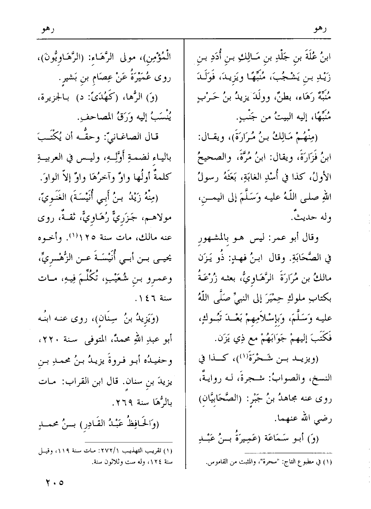 قالَ الصَّاغانيُّ: وحقُّه أنْ يُكْتَبَ بالياءِ لضمَّةِ أَوَّلِه، وليسَ فِي العربيَّةِ كَلمةٌ أَوَّلها وَاو وآخِرُها وَاو إلاَّ الْوَاو؛ (مِنْهُ زَيْدُ بنُ أَبي أُنَيْسَةَ) الغَنَويُّ مَوْلاهم، جزريٌّ} رَهاوِيٌّ ثِقَة، رَوَى عَنهُ مالِكُ، ماتَ سَنَة 125. وأَخُوهُ يَحْيَى بنُ أَبي أُنَيْسَةَ عَن الزهريِّ وعَمْرُو بنُ شُعَيْبٍ تُكُلِّم فِيهِ، ماتَ سنة 146. (ويزيدُ بنُ سِنانٍ) رَوَى عَنهُ ابْنُه أَبو عبدِ اللَّهِ محمدُ المُتَوفَّى سَنَة 220، وحَفِيدُه أَبو فَرْوَةَ يزيدُ بنُ محمدِ بنِ يَزِيد بنِ سِنانٍ؛ قالَ ابنُ القراب مَاتَ! بالرُّها سَنَة 269. (والحافِظُ عَبْدُ القادِرِ) بنُ محمدٍ