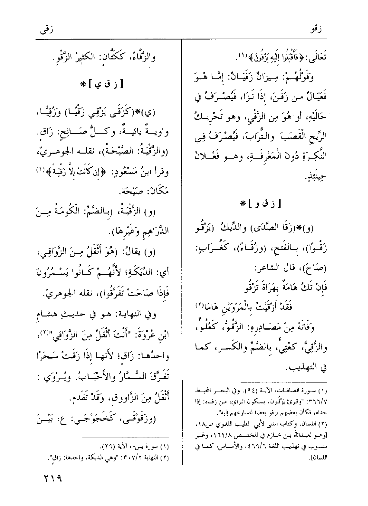 وَفِي النهايَةِ: هُوَ فِي حدِيثِ هشامِ بنِ عرْوَةَ: (أَنْتَ أَثْقَلُ مِن الزَّواقِي) ، واحِدُها} زاقٍ، لأنَّها إِذا {زَقَت سَحَراً تَفَرَّقَ السُّمَّارُ والأَحْبابُ، ويُرْوَى: أَثْقَلُ مِن الزَّاوُوق، وَقد تقدَّمَ.