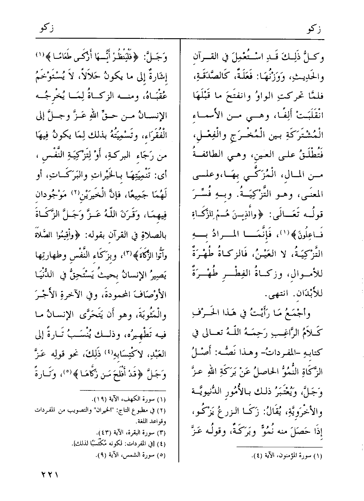 وأَجْمَع مَا رأَيْت فِي هَذَا الحَرْف كَلامُ الراغبِ، رحِمَه الله تَعَالَى فِي كتابهِ المَفْردَات، وَهَذَا نَصُّه: أَصْلُ الزَّكاةِ النُّموُّ الحاصِلُ عَن بَرَكةِ اللَّهِ، عزَّ وجلَّ، ويُعْتَبر ذلكَ بالأُمورِ الدّنيويَّةِ والأُخْروِيَّةِ، يقالُ: زَكا الزَّرْعُ يَزْكُو إِذا حَصَلَ مِنْهُ نُموٌّ وبركَةٌ.