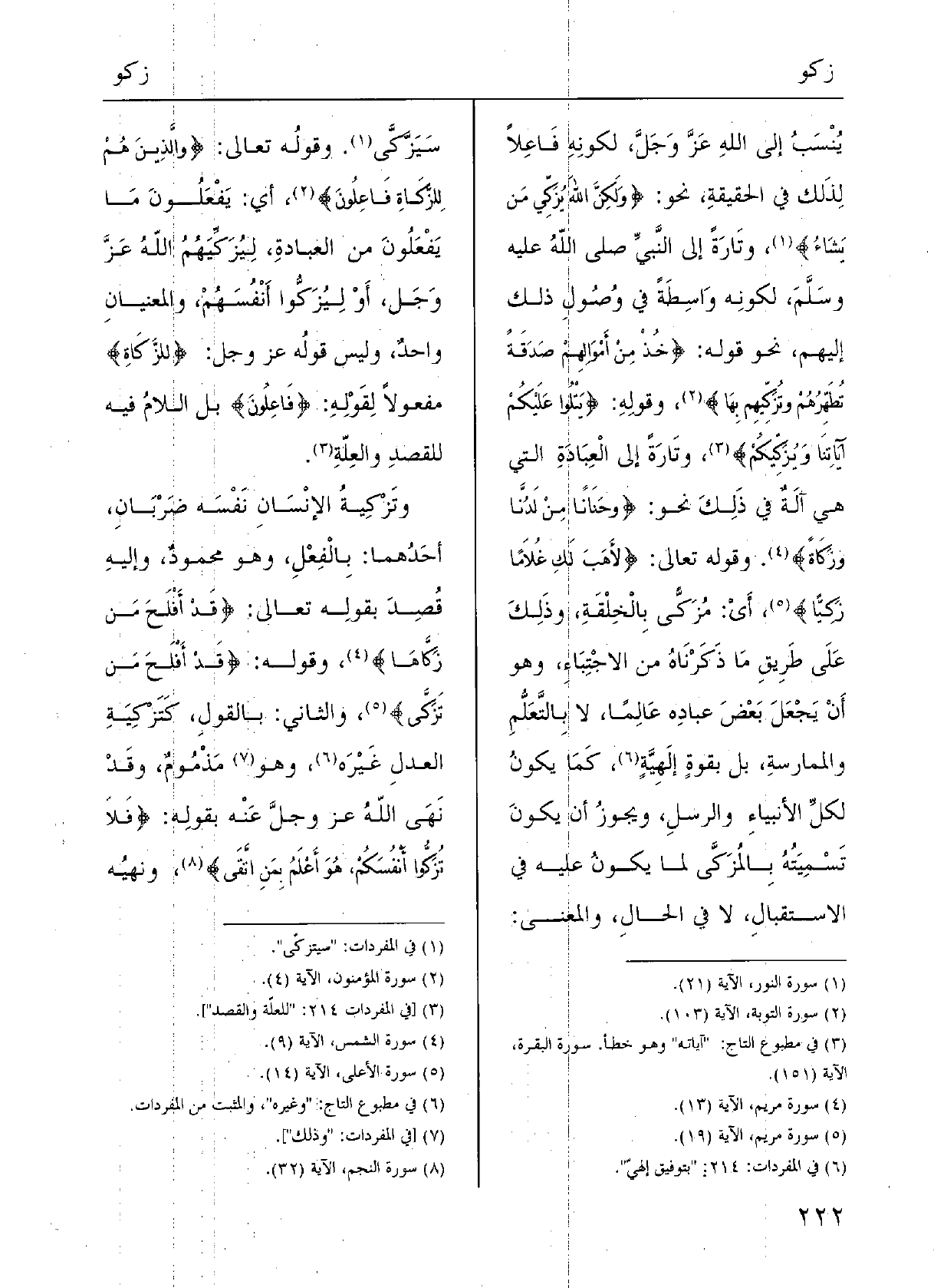 يُنْسَبُ إِلَى اللَّهِ، عزَّ وجلَّ، لكوْنِه فاعِلاً لذلِكَ فِي الحقِيقَةِ نَحْو: {ولكنَّ اللَّهَ {يُزَكّي مَنْ يَشاءُ} ؛ وتارَةً إِلَى النبيِّ صلى الله عَلَيْهِ وسلملكوْنه واسِطَة فِي وُصولِ ذلكَ إِلَيْهِم نَحْو قوْلِه: {خُذْ مِن أَمْوالِهم صَدَقَةً تُطَهِّرُهم} وتُزَكِّيهم بهَا} وقوْلُه: {يَتْلُو عَلَيْكم آياتِهُ {ويُزَكِّيكم} ؛ وتارَةً إِلَى العِبادَةِ الَّتِي هِيَ آلَةٌ فِي ذلِك نَحْو: {وَحَنَانًا مِن لدُنَّا} وزَكاةً} ، وقوْله تَعَالَى: {لأَهِبَ لكَ غُلاماً {زَكِيّاً} أَي} مُزَكىً بالخِلْقَةِ وذلكَ على طَريقِ مَا ذَكَرْناه من الاجْتِباءِ، وَهُوَ أنْ يجعلَ بعضَ عِبادِهِ عالِماً لَا بالتَّعَلُّمِ والمُمارَسَةِ، بل بقوَّةٍ إلهيَّةٍ كَمَا يكونُ لكلِّ الأَنْبياءِ والرُّسُل.
